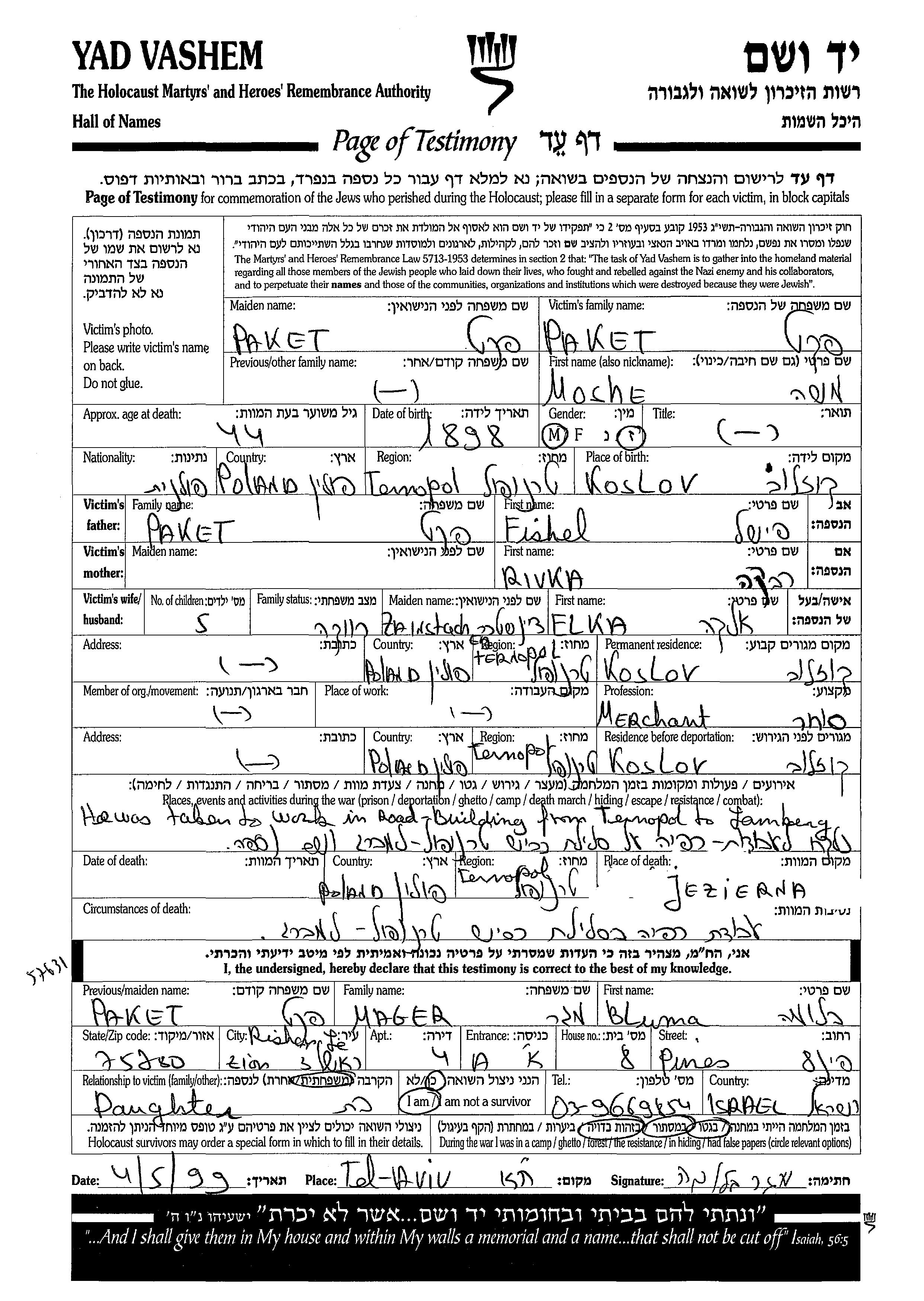 Moshe Paket wurde im Jahr 1898 in Kozlow, Polen geboren. Er war Kaufmann/-frau. Vor dem Zweiten Weltkrieg lebte er in Kozlow, Polen.