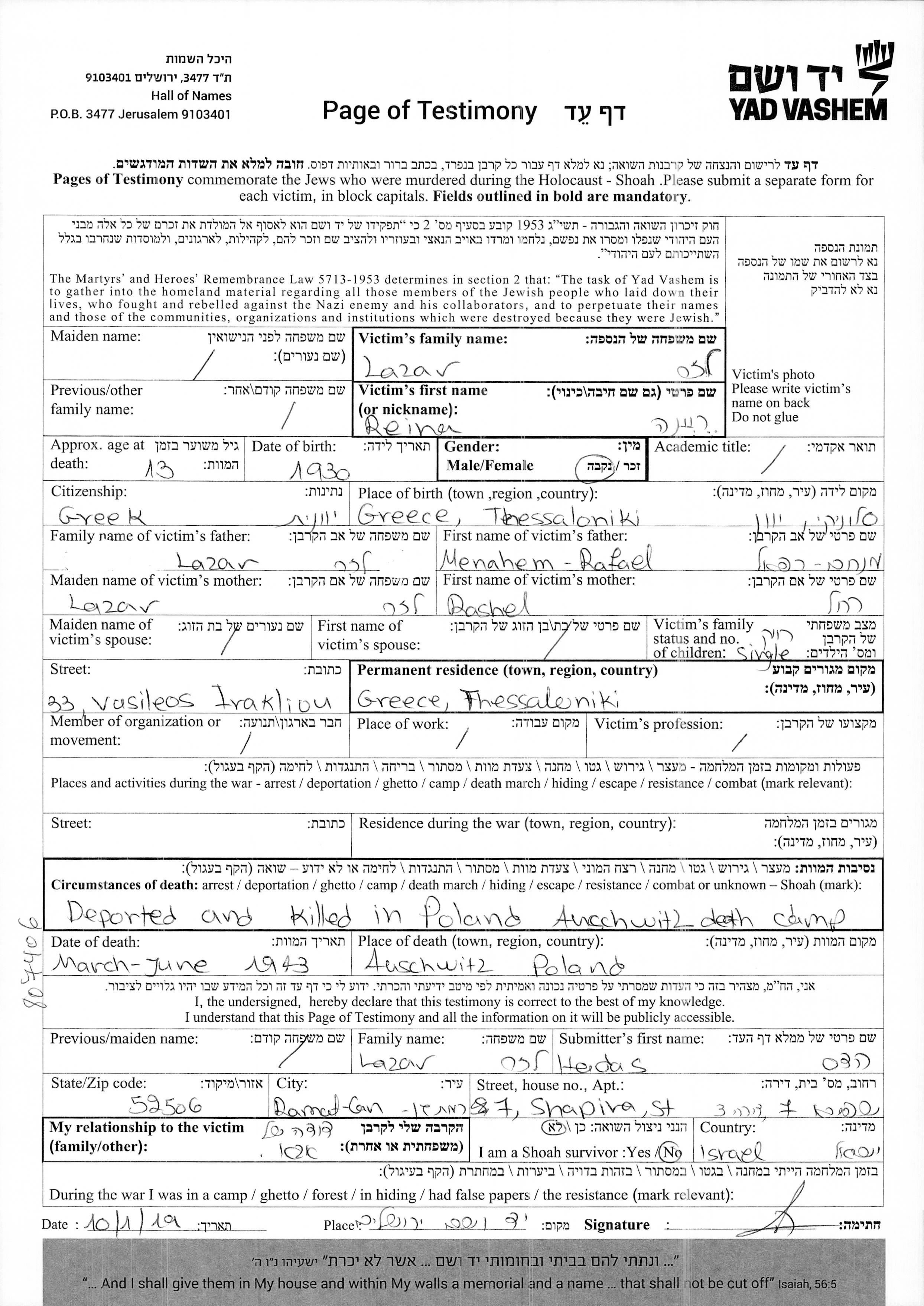 Lazar Rena Thessaloniki, Griechenland Liste von ermordeten Personen