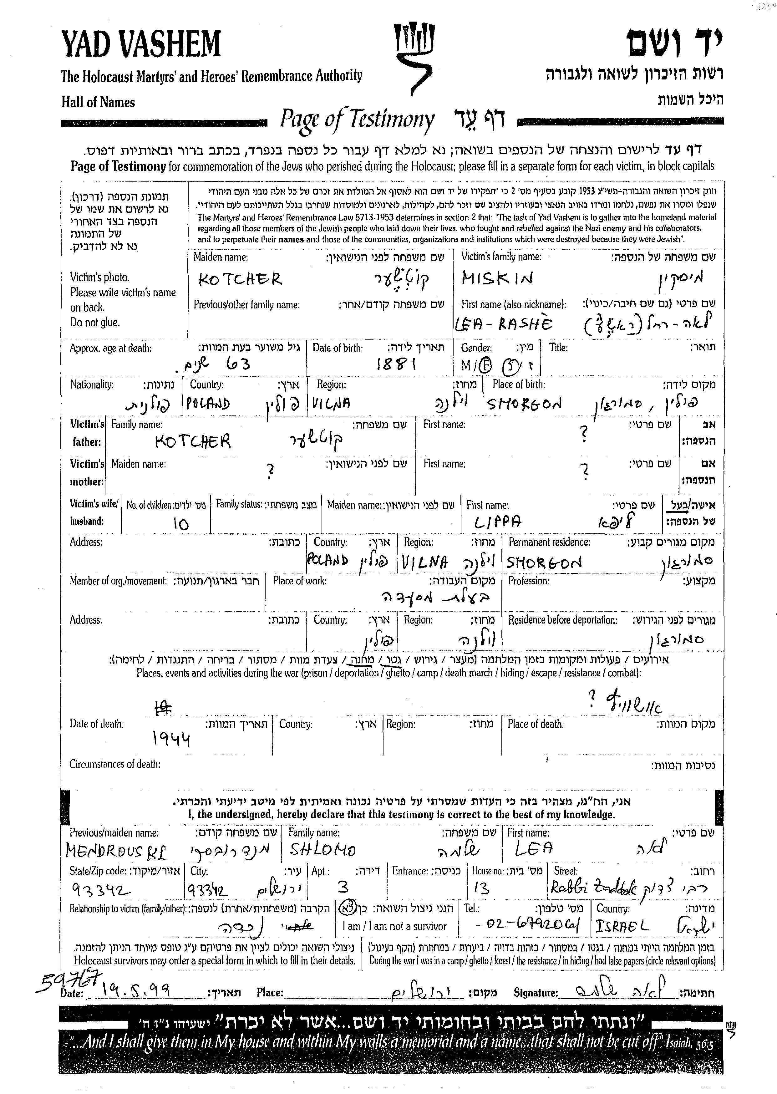 Rashe Lea Miskin, geb. Kotcher Kucher wurde im Jahr 1881 in Smorgonie, Polen geboren. Sie war Restaurantbesitzer/-in. Vor dem Zweiten Weltkrieg lebte sie in Smorgonie, Polen.