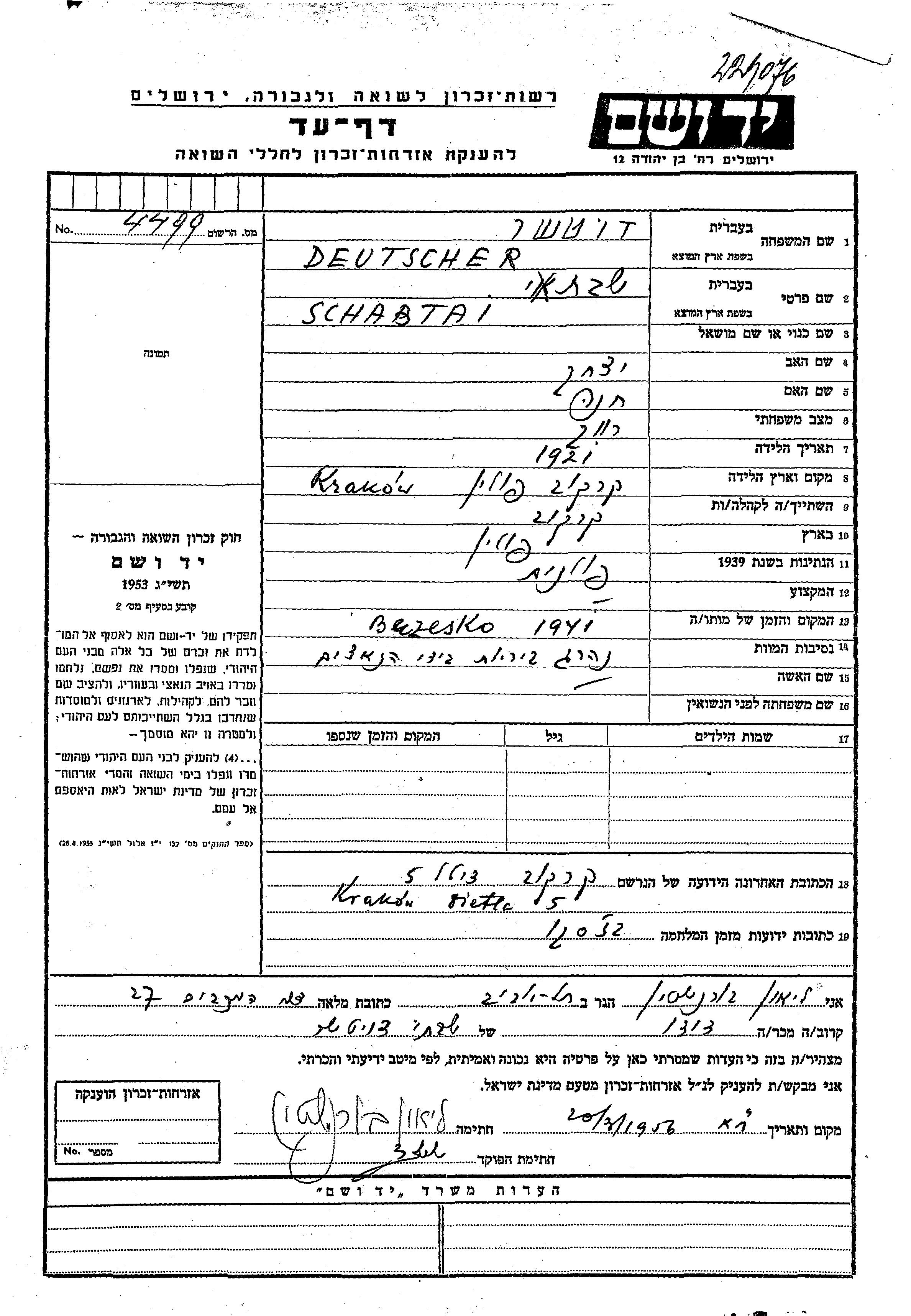 Schabtai Sigmunt Deutscher wurde im Jahr 1921 in Krakow, Polen geboren. Vor dem Zweiten Weltkrieg lebte er in Krakow, Polen.