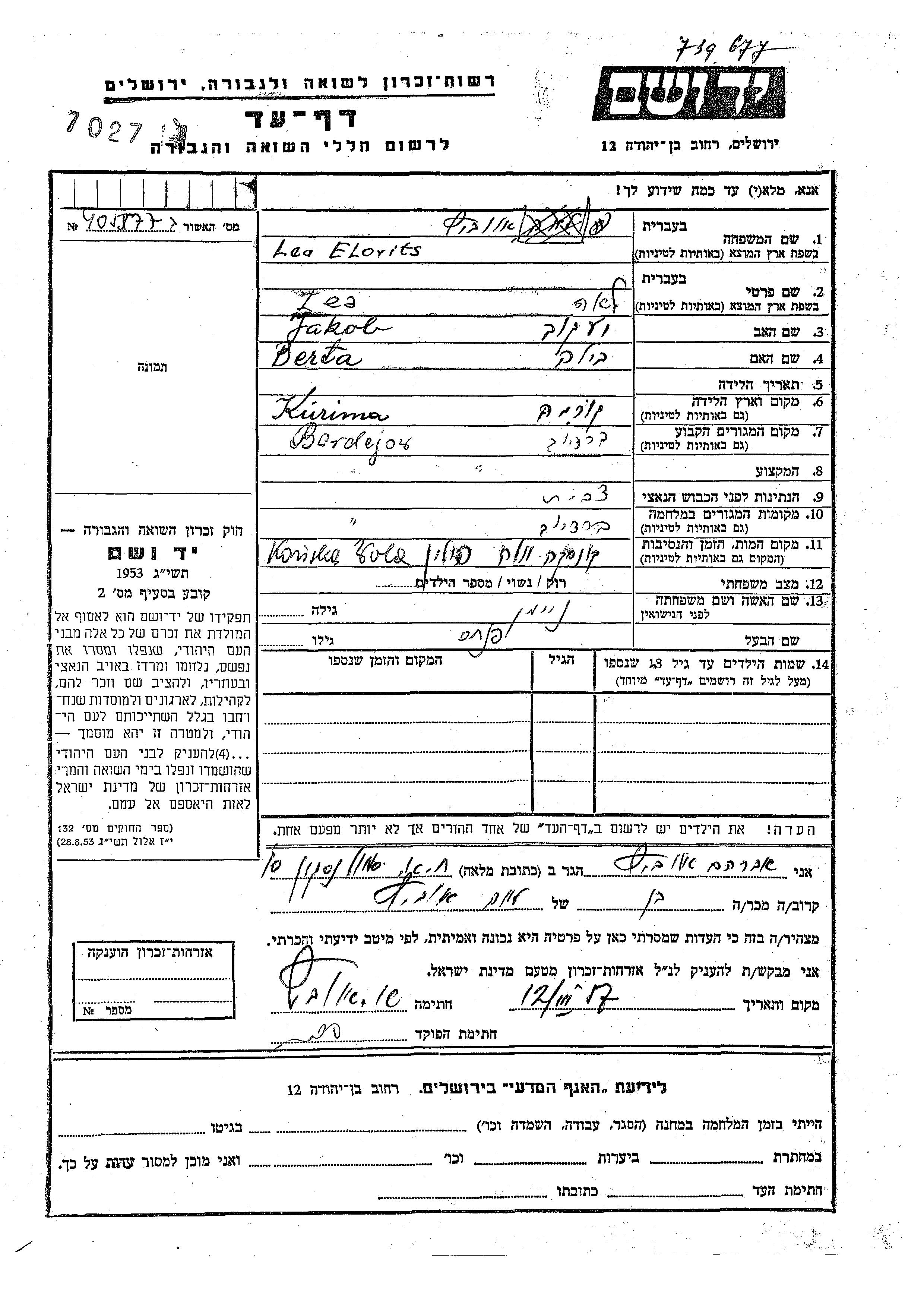 Lea Elovits, geb. Neiman wurde in Kurima, Tschechoslowakei geboren. Sie war die Tochter von Jakov und Bila. Sie war mit Pinkhas Verheiratet. Vor dem Zweiten Weltkrieg lebte sie in Bardejov, Tschechoslowakei. Während des Krieges war sie in Bardejov, Tschechoslowakei.