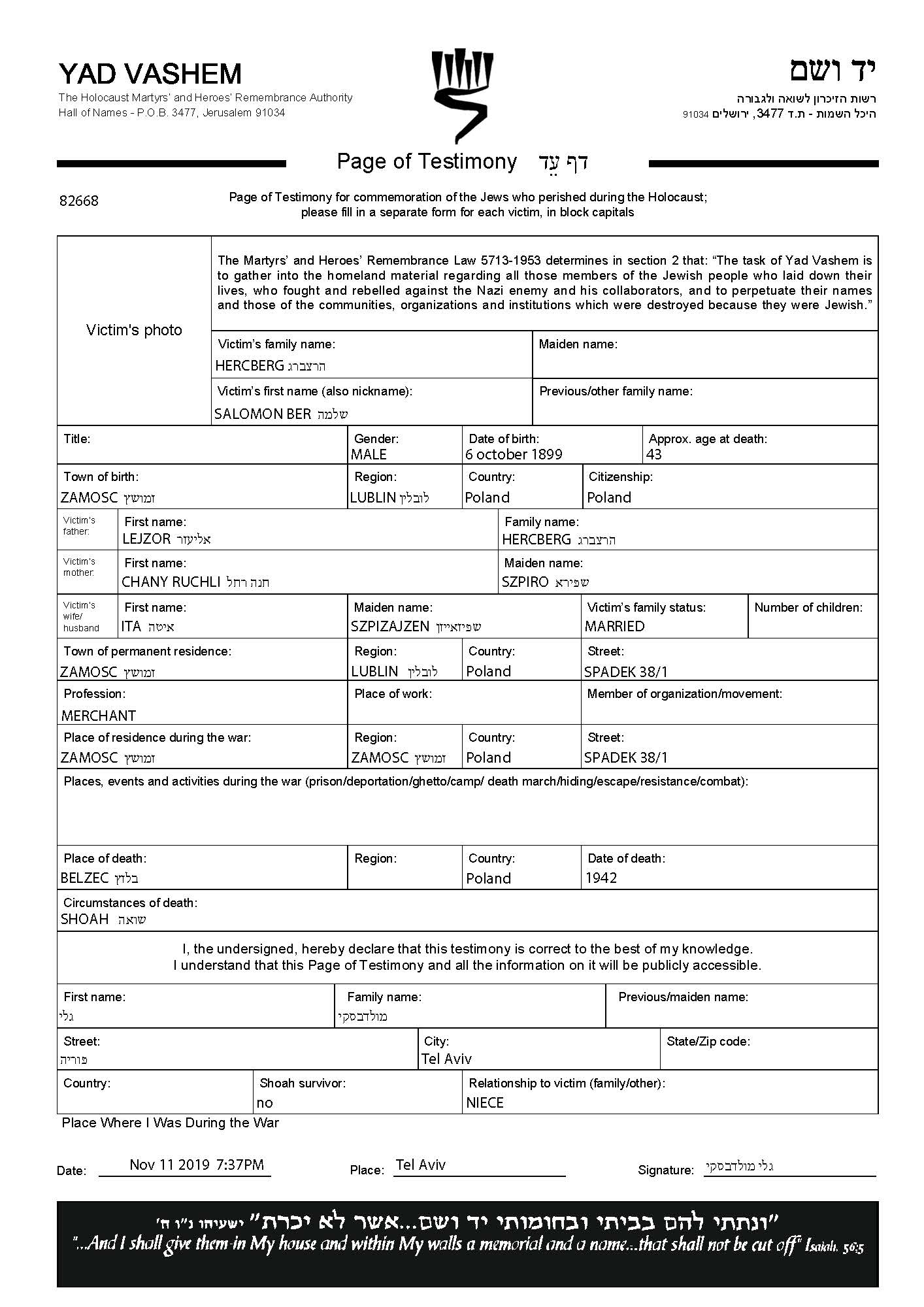 Hercberg Salomon Ber 1899 Zamosc, Polen Gedenkblatt (digital)