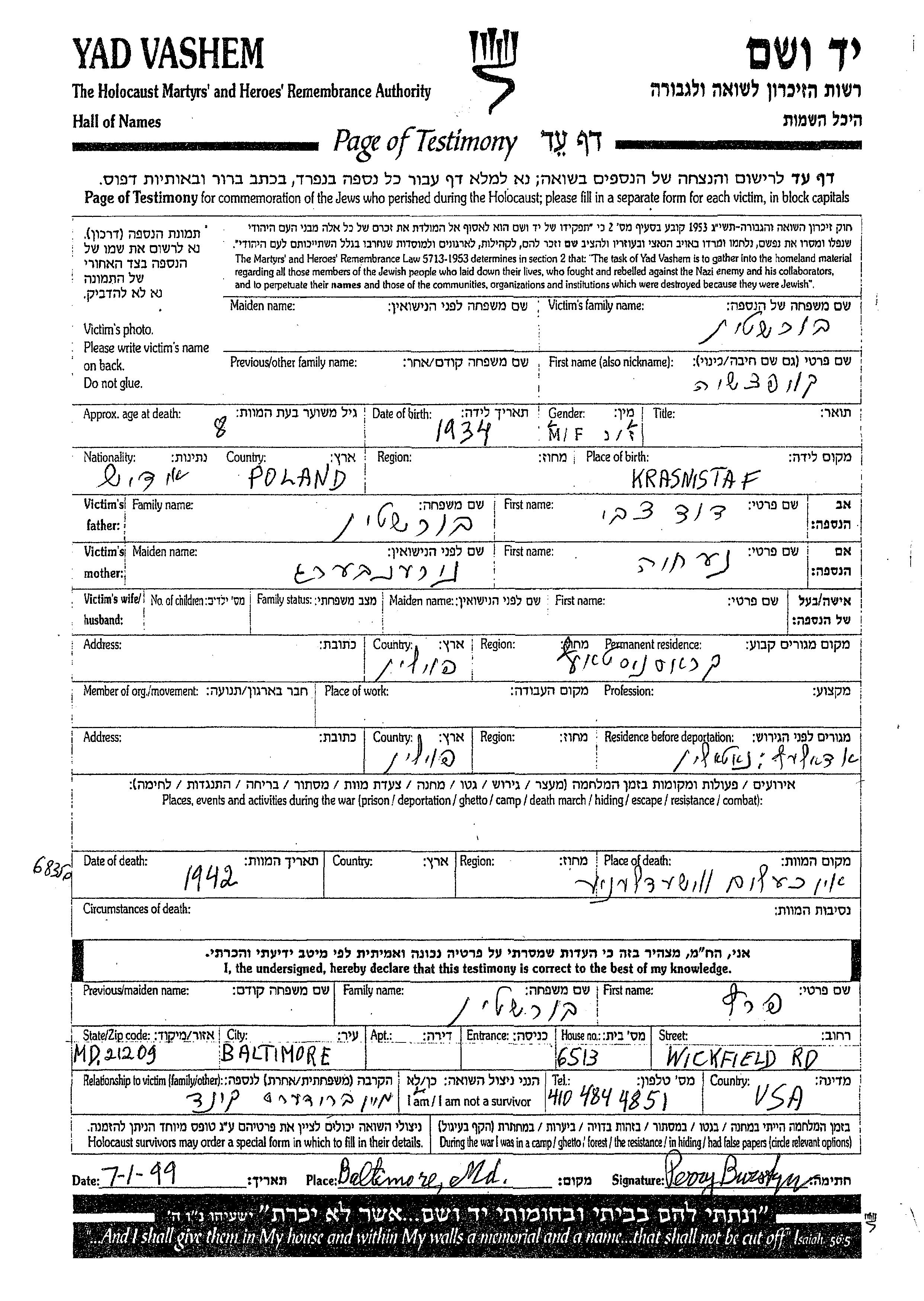Koipcha Burstyn wurde im Jahr 1934 in Krasnistav, Polen geboren. Vor dem Zweiten Weltkrieg lebte er in Krasnistav, Polen.