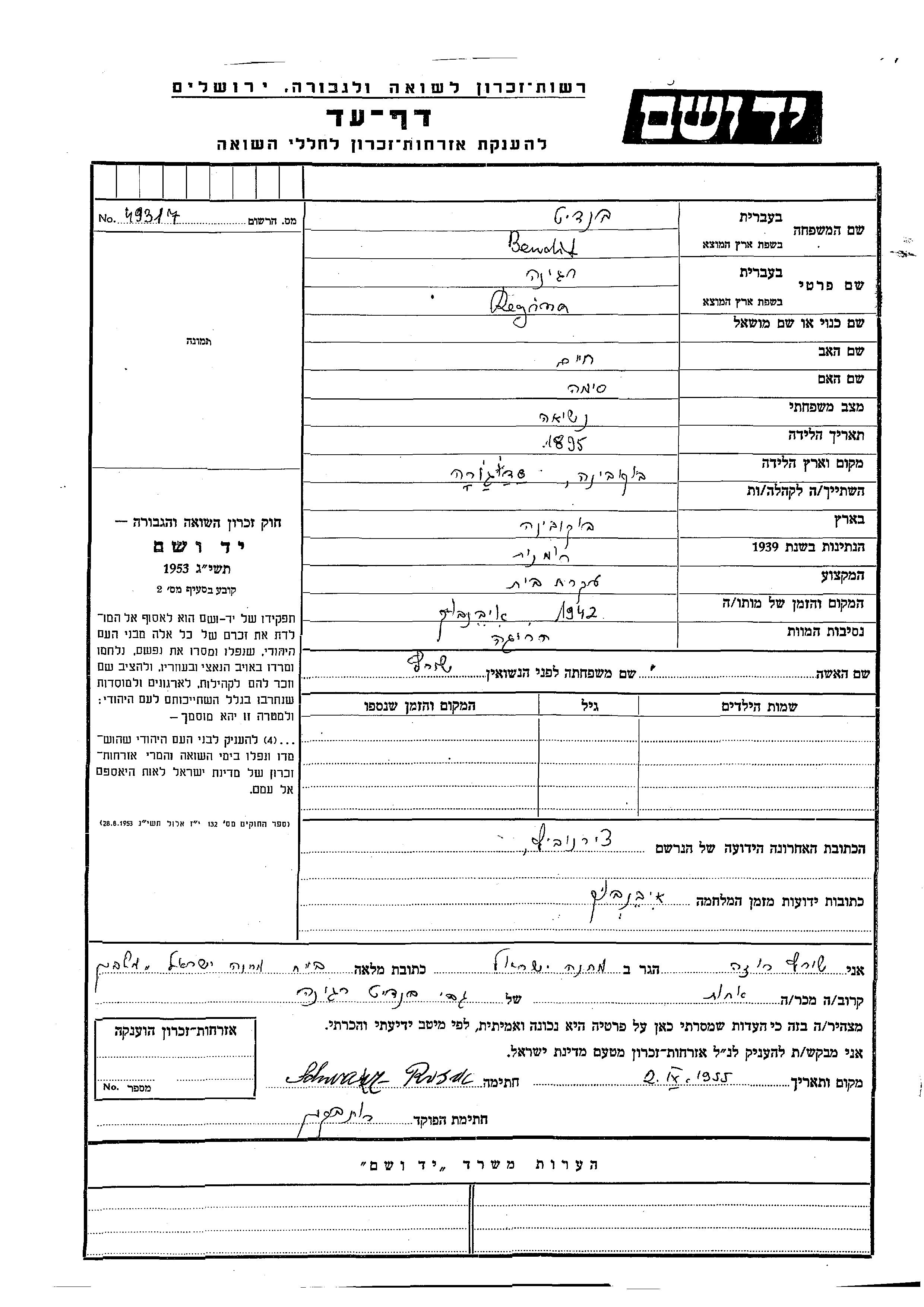Regina Bendit, geb. Shvartz wurde im Jahr 1895 in Sadagura, Rumänien geboren. Sie war die Tochter von Khaim und Sima. Sie war Hausfrau und Verheiratet. Vor dem Zweiten Weltkrieg lebte sie in Czernowitz, Rumänien. Während des Krieges war sie in Ivanovichi, Ukraine (UdSSR).