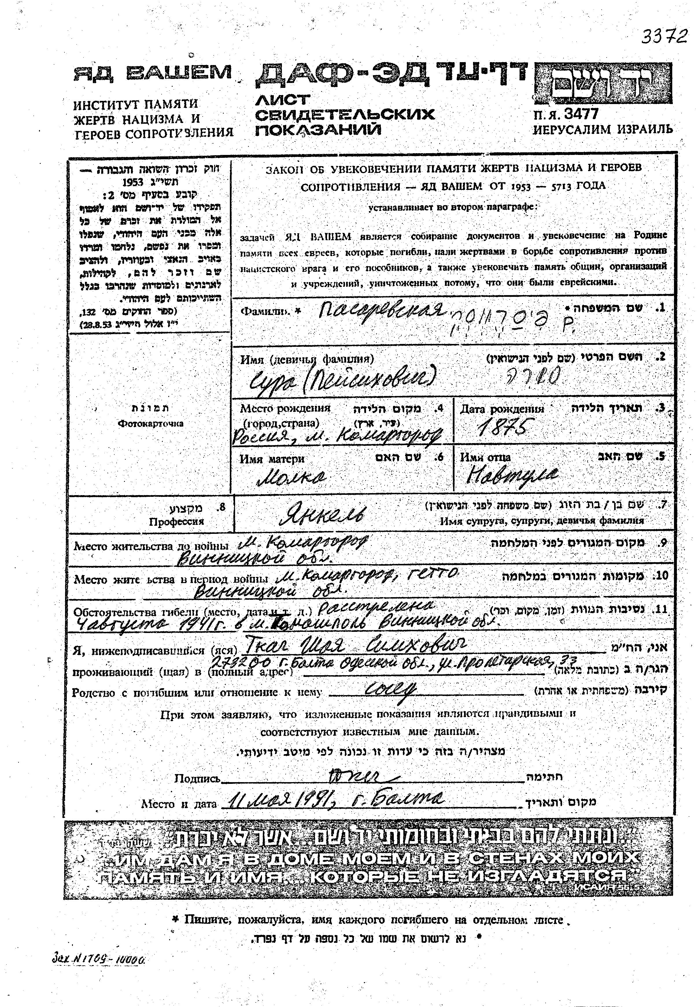 Sura Pisarevskaya, geb. Peisikhovich wurde im Jahr 1875 in Komargorod, Ukraine (UdSSR) geboren. Vor dem Zweiten Weltkrieg lebte sie in Komargorod, Ukraine (UdSSR).
