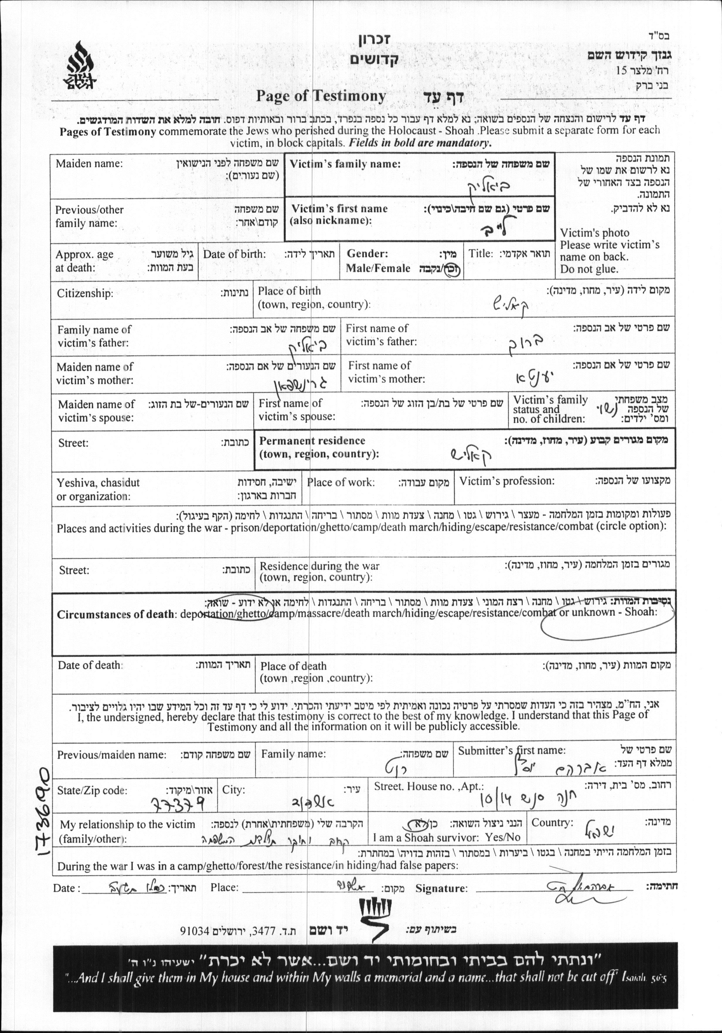Bialik | Leibel | Kalisz, Polen | Gedenkblatt |
