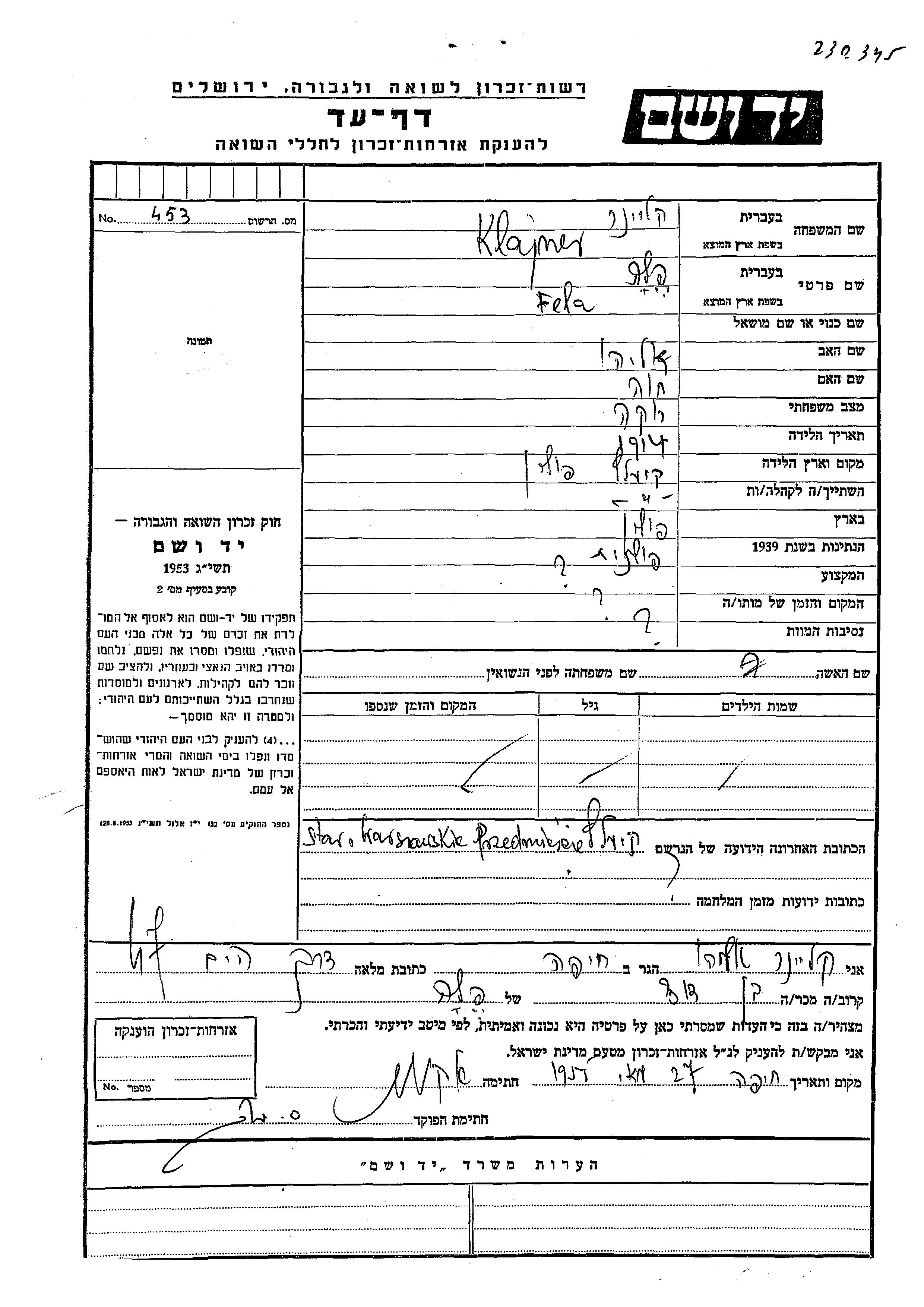 Fela Klajner wurde im Jahr 1914 in Kielce, Polen geboren. Vor dem Zweiten Weltkrieg lebte sie in Kielce, Polen.