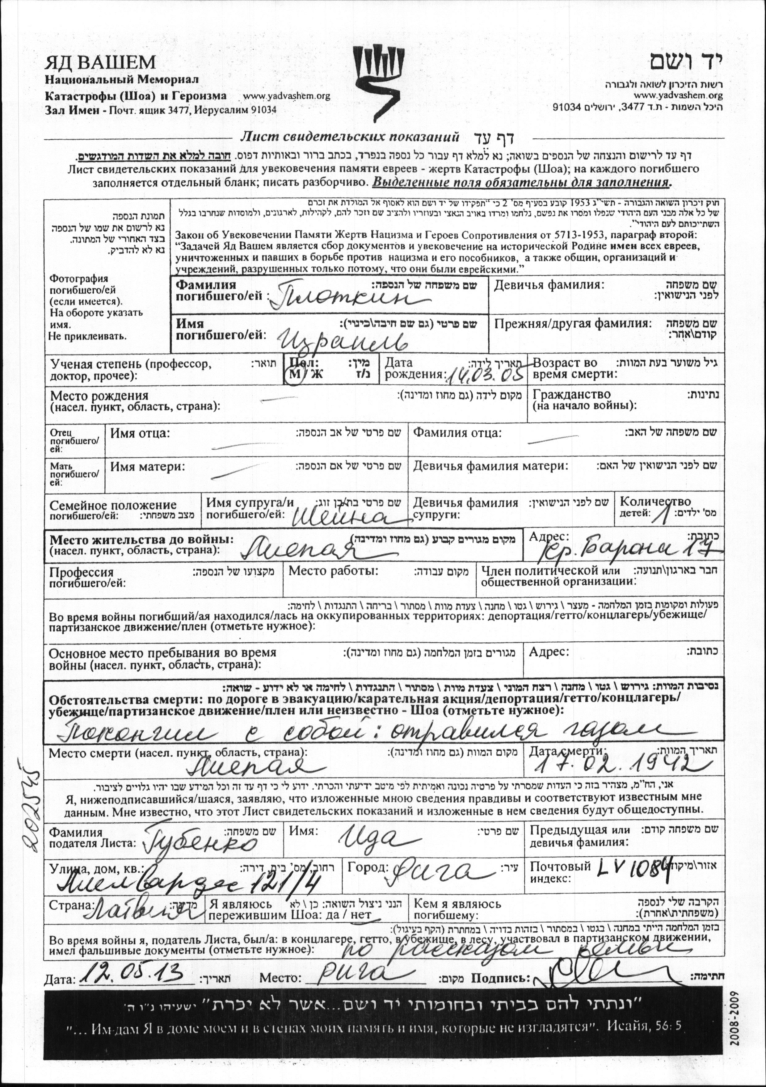 Plotkins | Izraels | 1905 | Liepaja, Lettland | Verfolgtenliste |