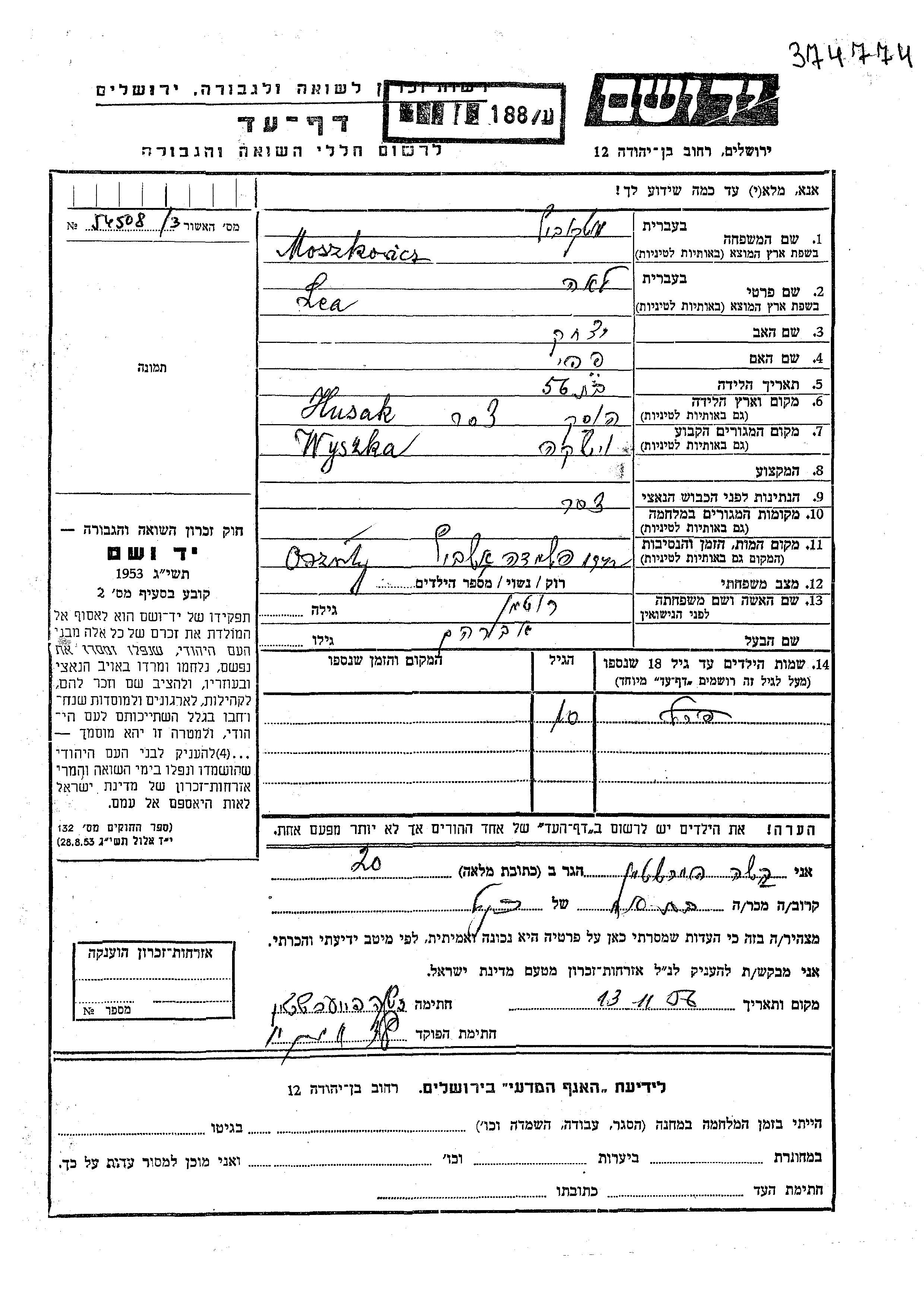 Perel Moszkovich. Vor dem Zweiten Weltkrieg lebte sie in Wyszkow, Polen.