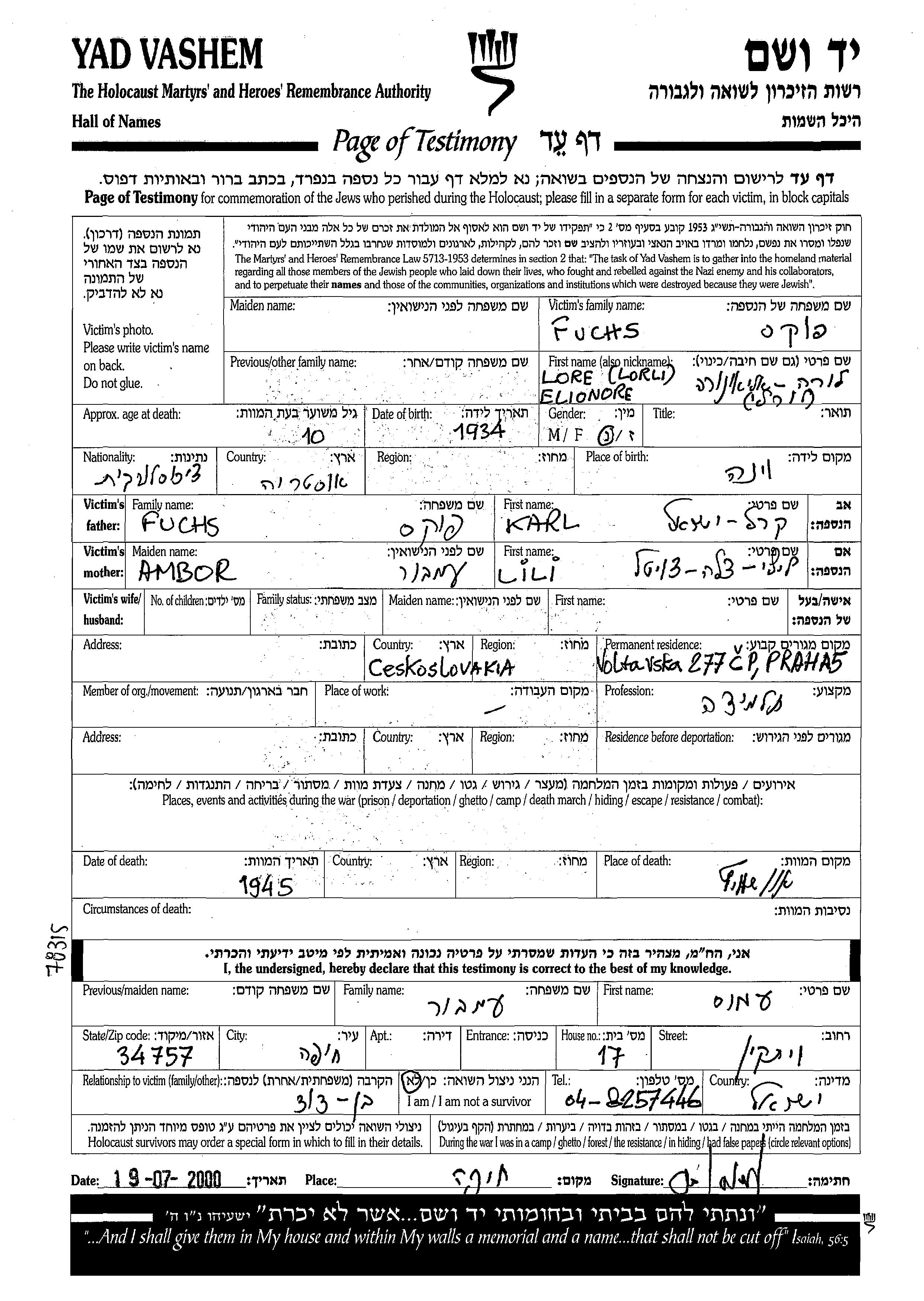 Lore Ester Elionore Fuchs wurde im Jahr 1934 in Wien, Österreich geboren. Sie war Schüler/-in. Vor dem Zweiten Weltkrieg lebte sie in Praha, Tschechoslowakei.