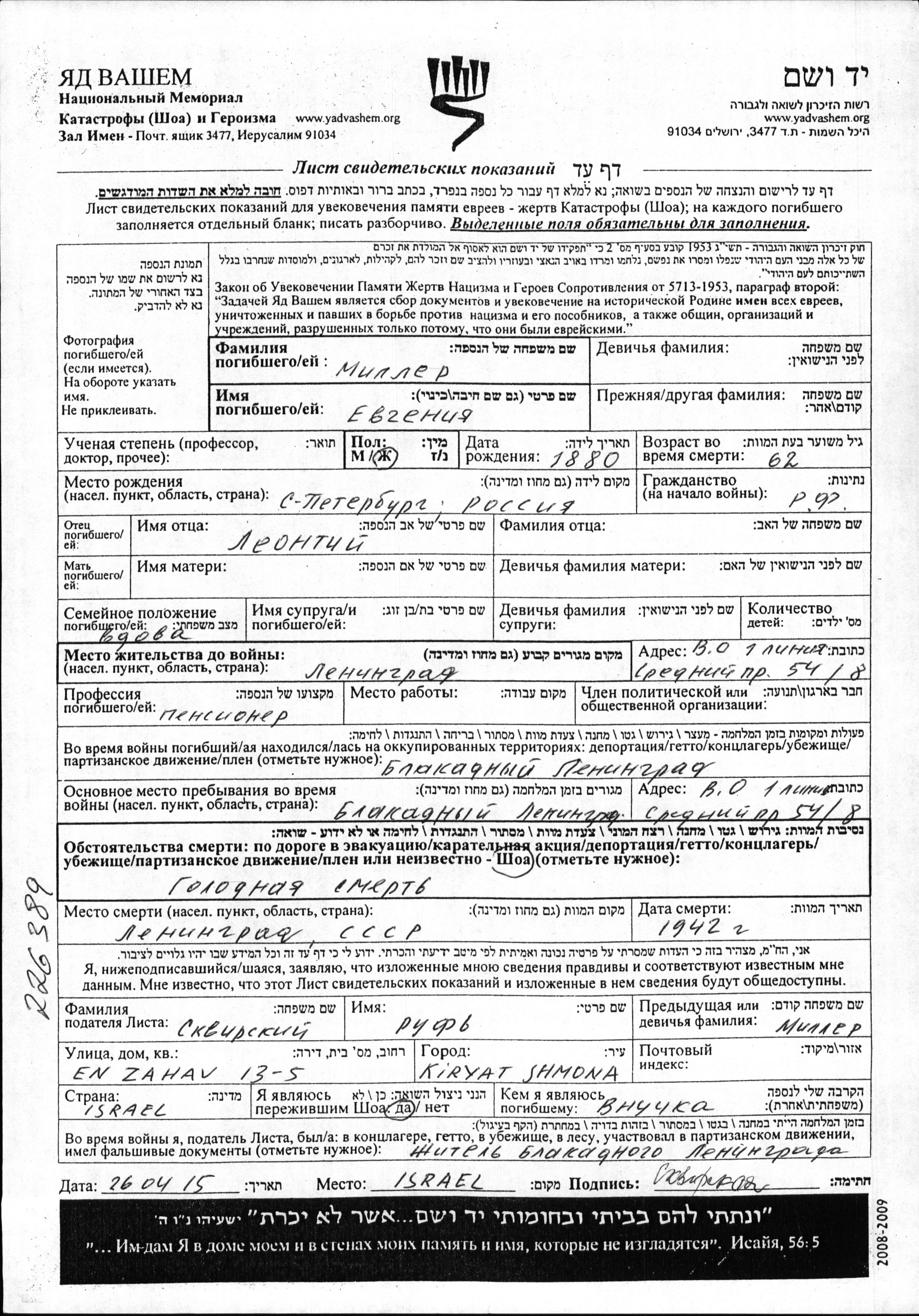 Yevgeniya wurde in der Zeit zwischen 1933-1945 in indirekter Beziehung mit der Shoah umgekommen. Todesort: Leningrad, Russland (UdSSR) im Jahr 1942.
