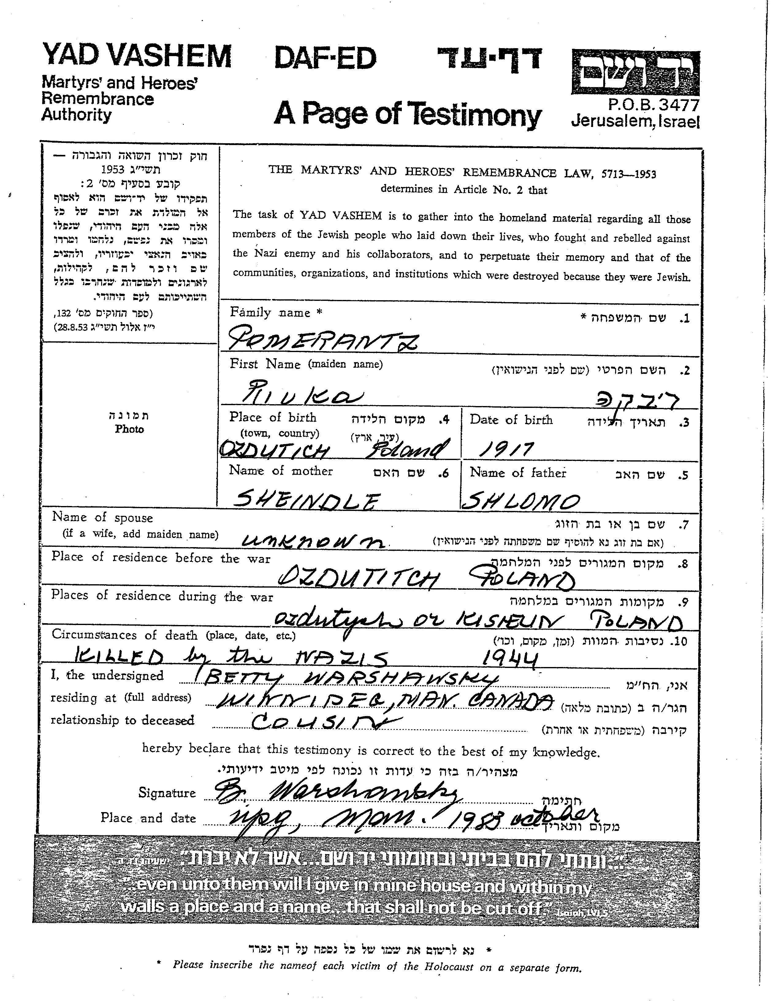 Rivka Pomeranc wurde im Jahr 1917 in Ozdziutycze, Polen geboren. Vor dem Zweiten Weltkrieg lebte sie in Ozdziutycze, Polen.