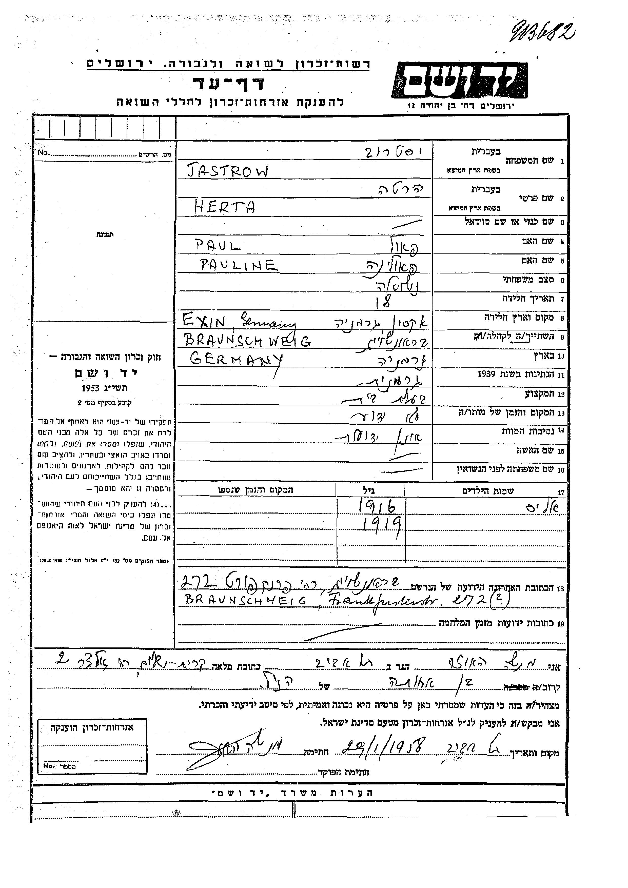 Ellis Jastrow wurde im Jahr 1916 geboren. Vor dem Zweiten Weltkrieg er/sie in Braunschweig, Deutsches Reich.