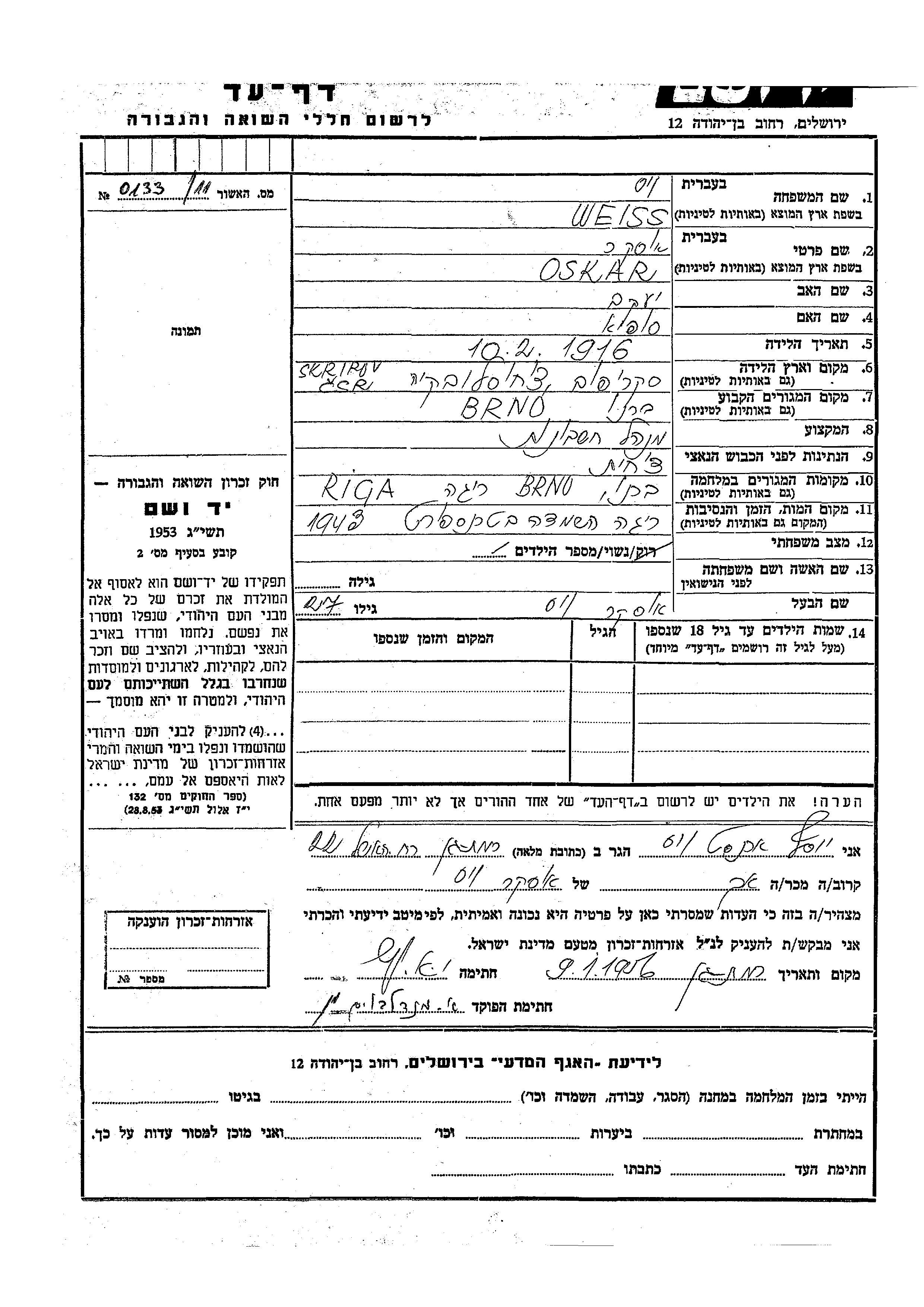 Oskar Weiss wurde im Jahr 1916 in Skripov, Tschechoslowakei geboren. Er war der Sohn von Yaakov und Sofia. Er war Buchhalter/-in und Verheiratet. Vor dem Zweiten Weltkrieg lebte er in Brno, Tschechoslowakei. Während des Krieges war er in Riga, Lettland.