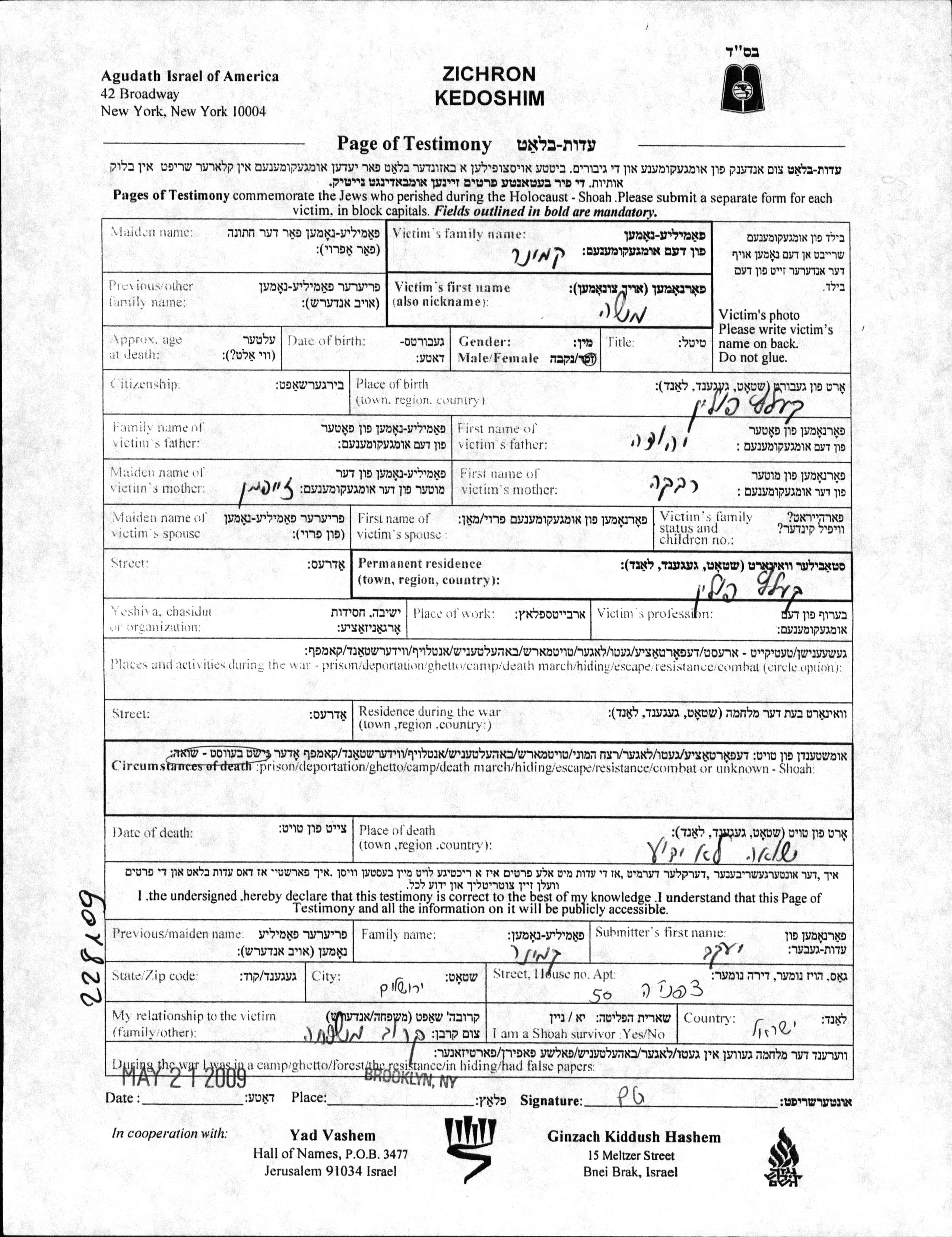 Kaminer Moshe Kielce, Polen Gedenkblatt