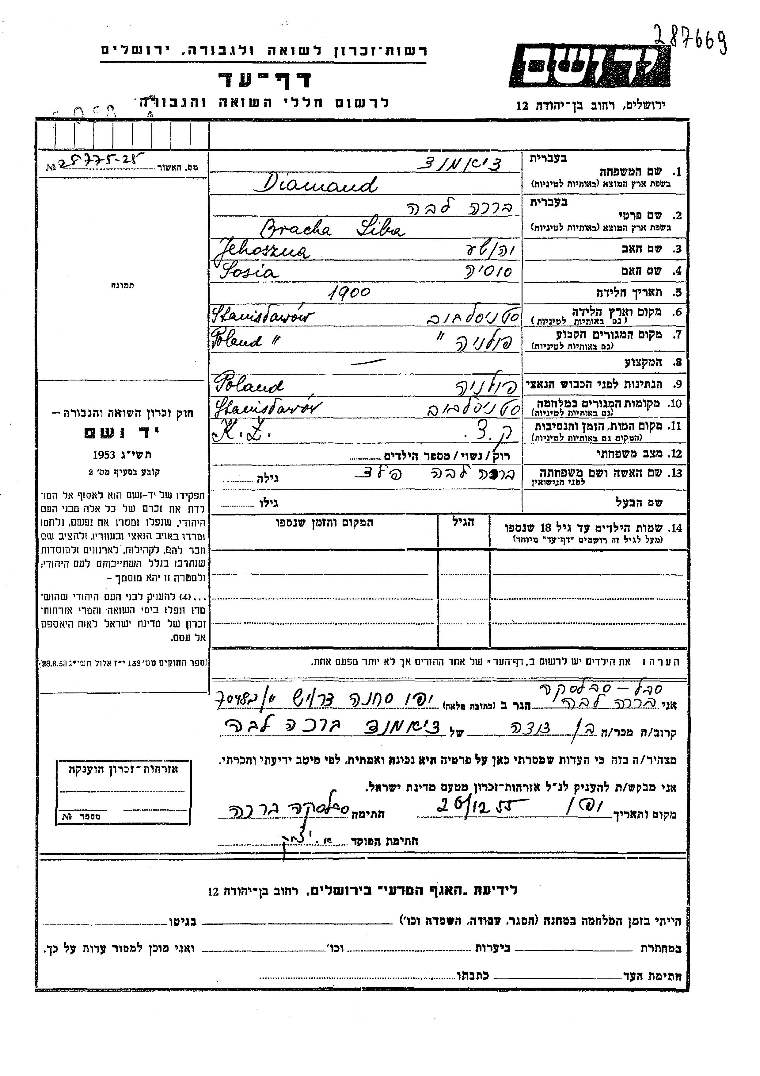 Bracha Leba Diamand, geb. Feld wurde im Jahr 1900 in Stanislawow, Polen geboren. Sie war die Tochter von Jehoszua und Sosia. Sie war Verheiratet. Vor dem Zweiten Weltkrieg lebte sie in Stanislawow, Polen. Während des Krieges war sie in Stanislawow, Polen.