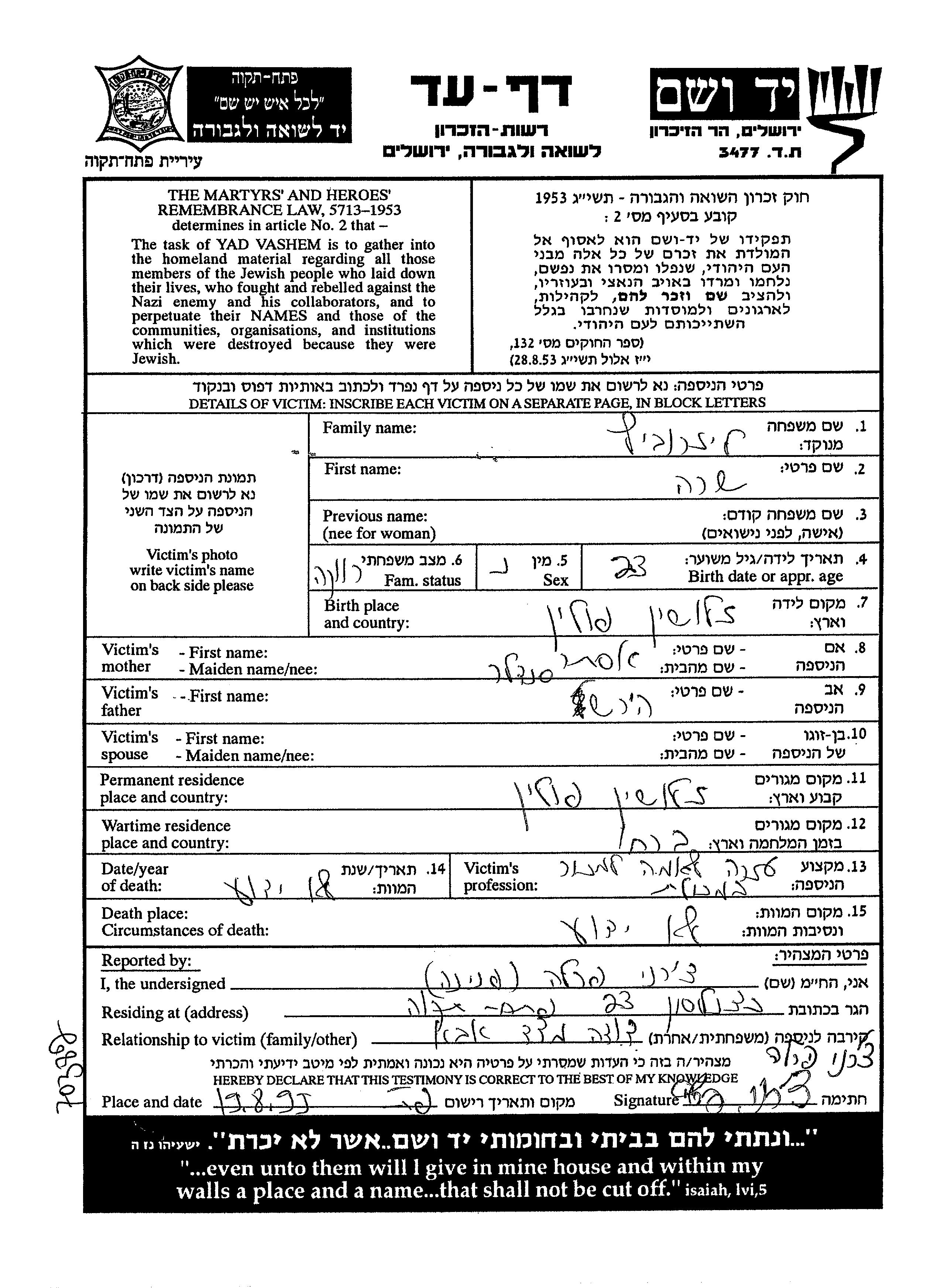 Lizerovitz Sara Zloszyn, Polen Gedenkblatt