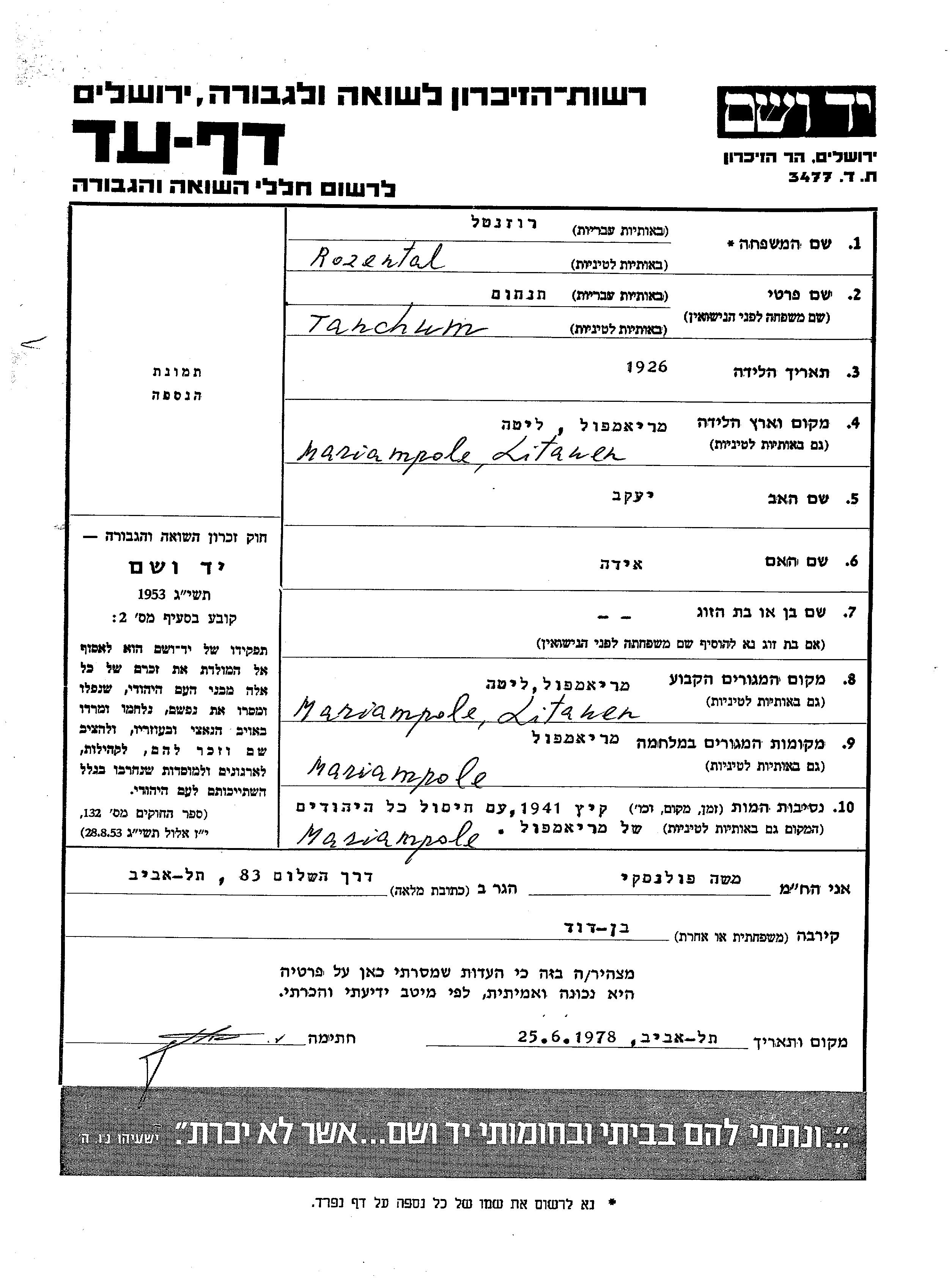 Rozental | Tanchum | 1926 | Mariampole, Litauen | Gedenkblatt |