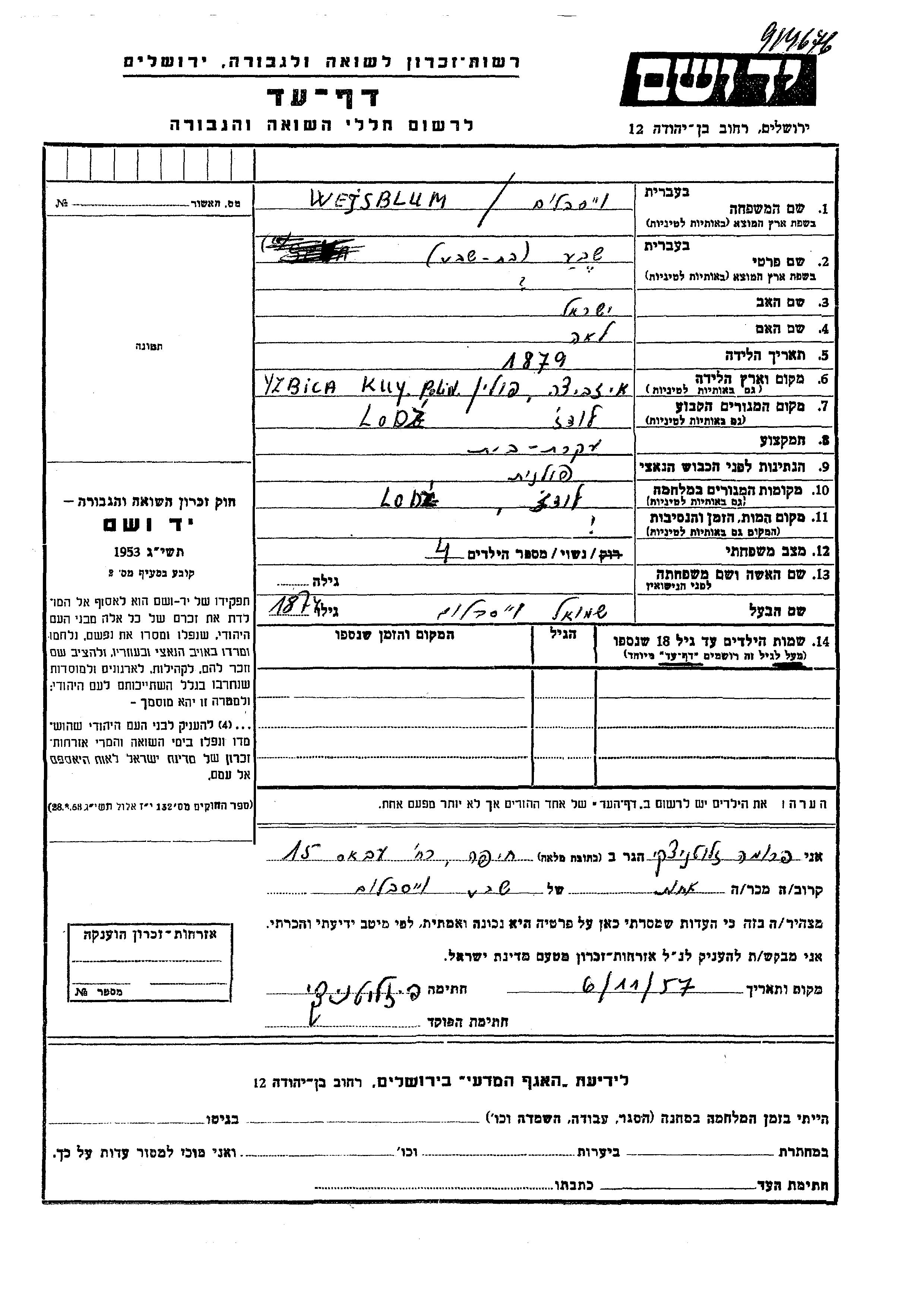 Sheva Wejsblum wurde im Jahr 1879 in Izbica Kujawska, Polen geboren. Sie war die Tochter von Yisrael und Lea. Sie war Hausfrau und mit Shmuel Verheiratet. Vor dem Zweiten Weltkrieg lebte sie in Lodz, Polen. Während des Krieges war sie in Lodz, Polen.