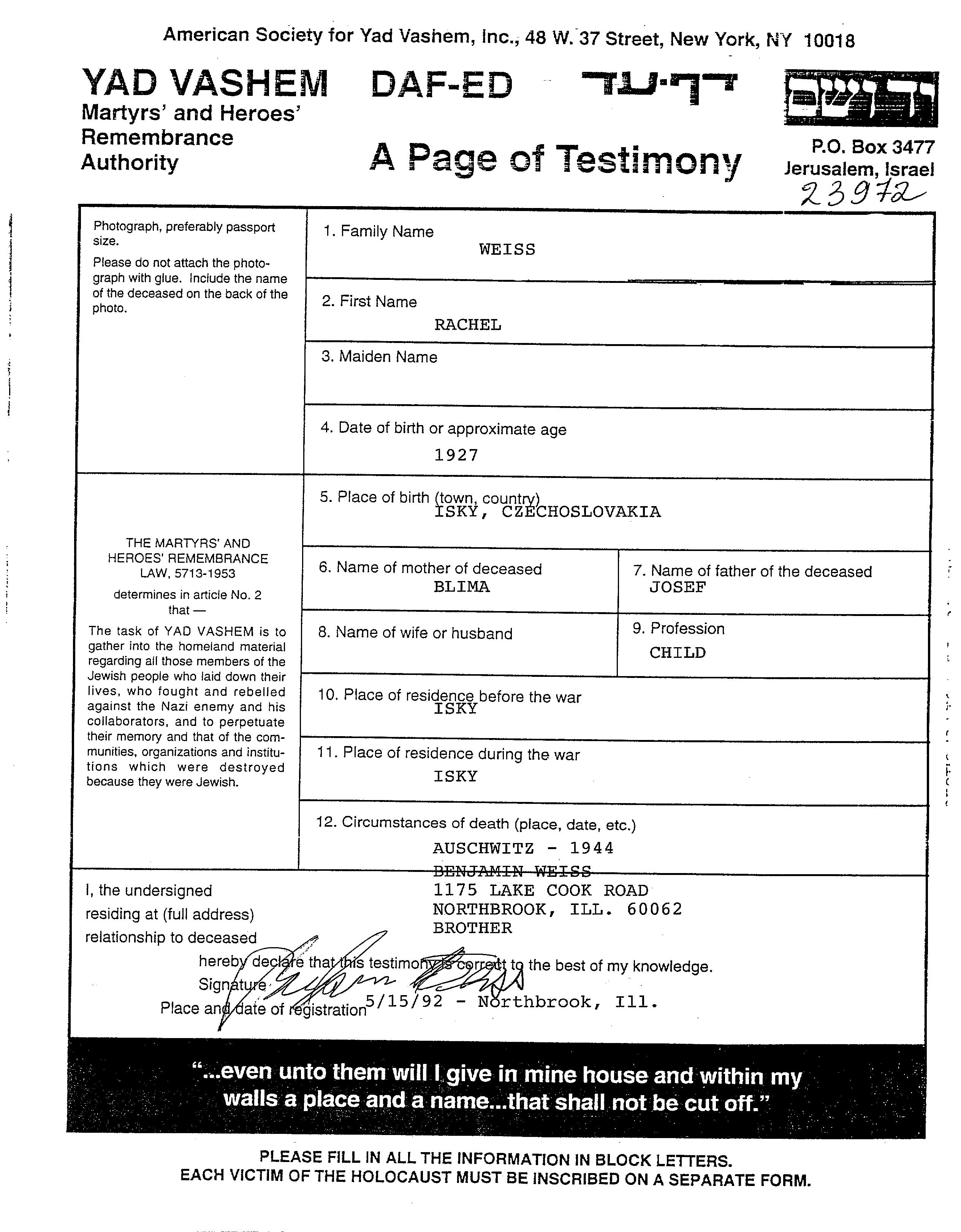 Weiss Rachel 1927 Isky, Tschechoslowakei Gedenkblatt