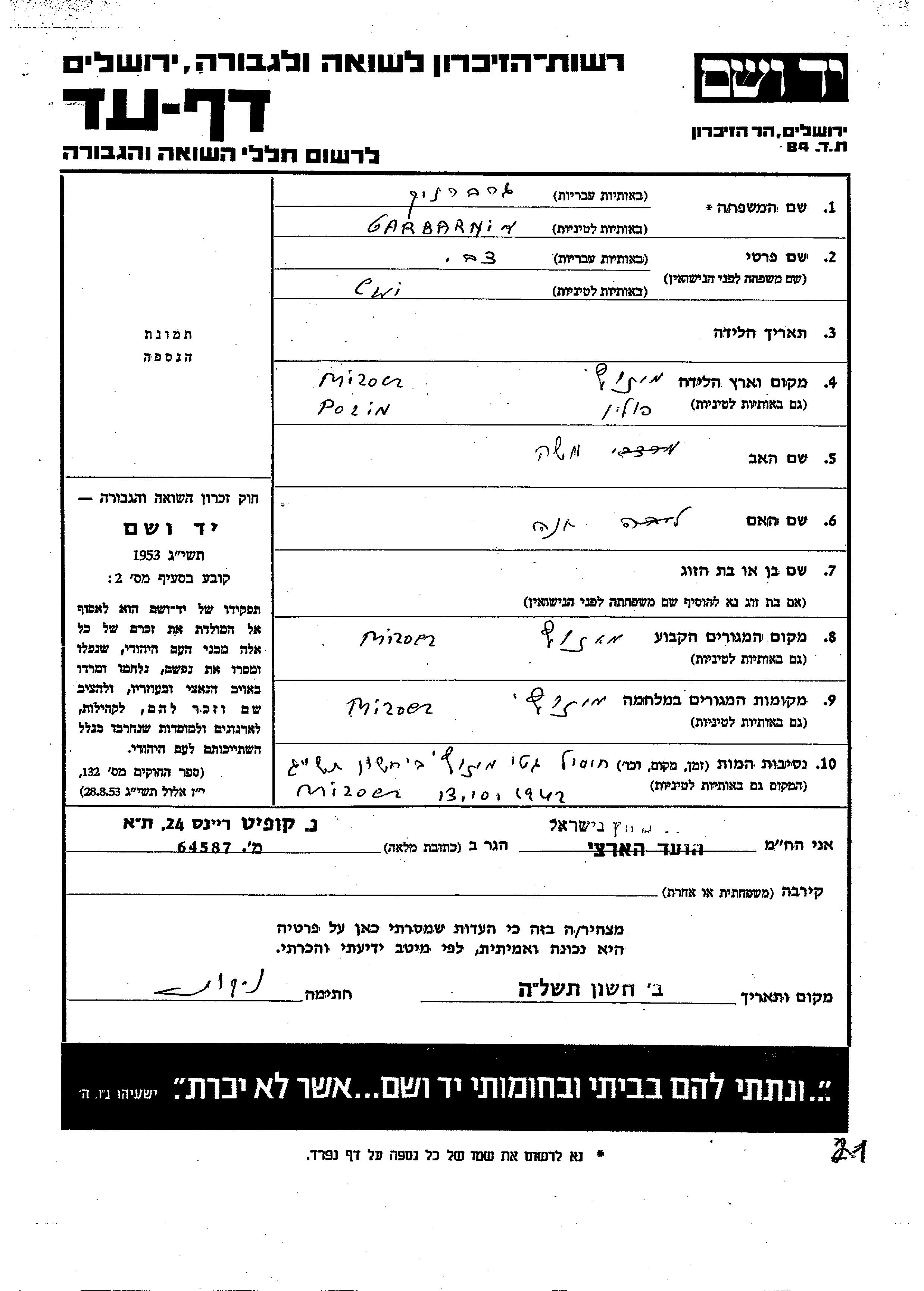 Tzvi Garbarnik wurde in Mizocz, Polen geboren. Vor dem Zweiten Weltkrieg lebte er in Mizocz, Polen.
