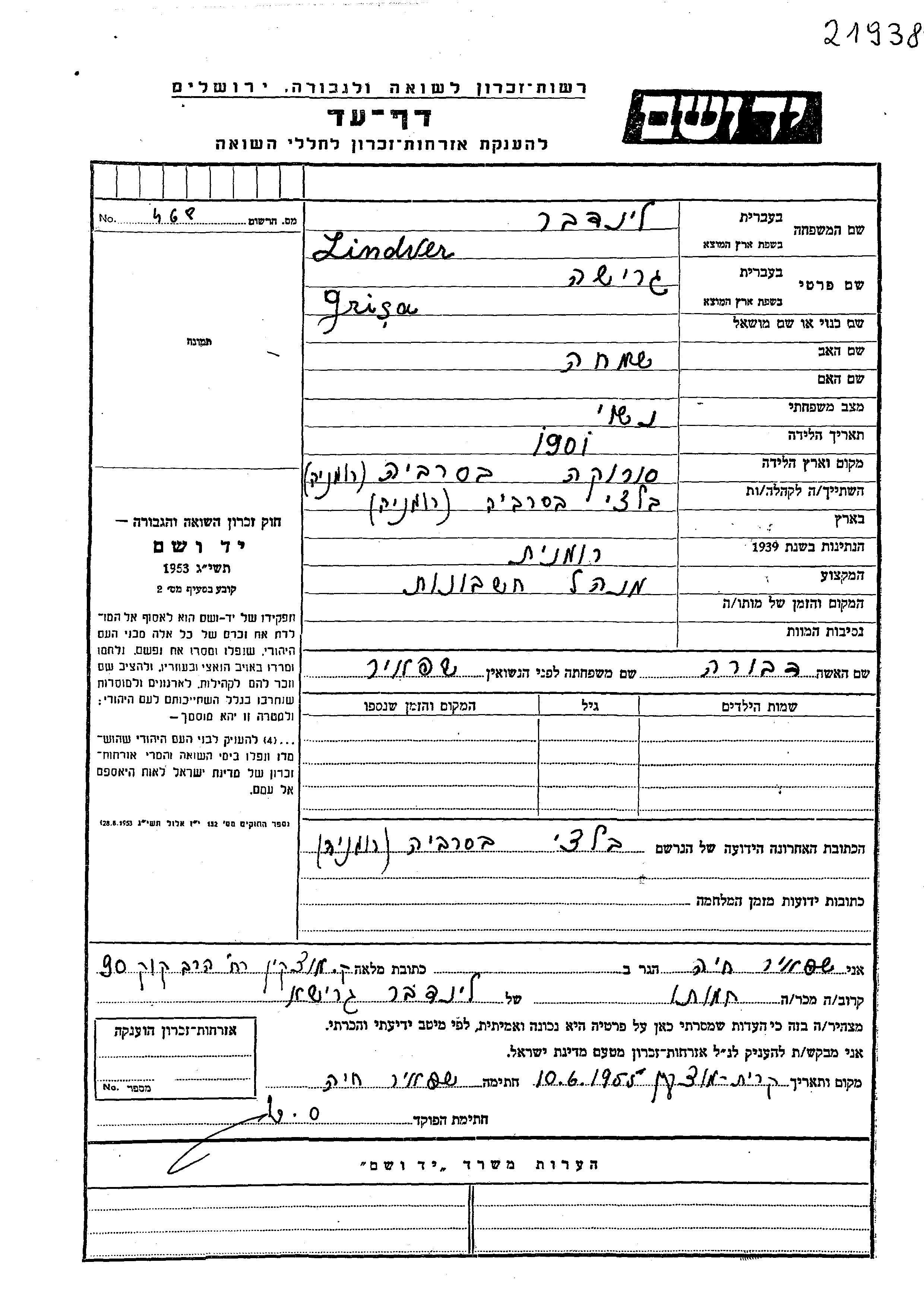 Grisa Lindwer wurde im Jahr 1901 in Soroca, Rumänien geboren. Er war Buchhalter/-in. Vor dem Zweiten Weltkrieg lebte er in Balti, Rumänien.
