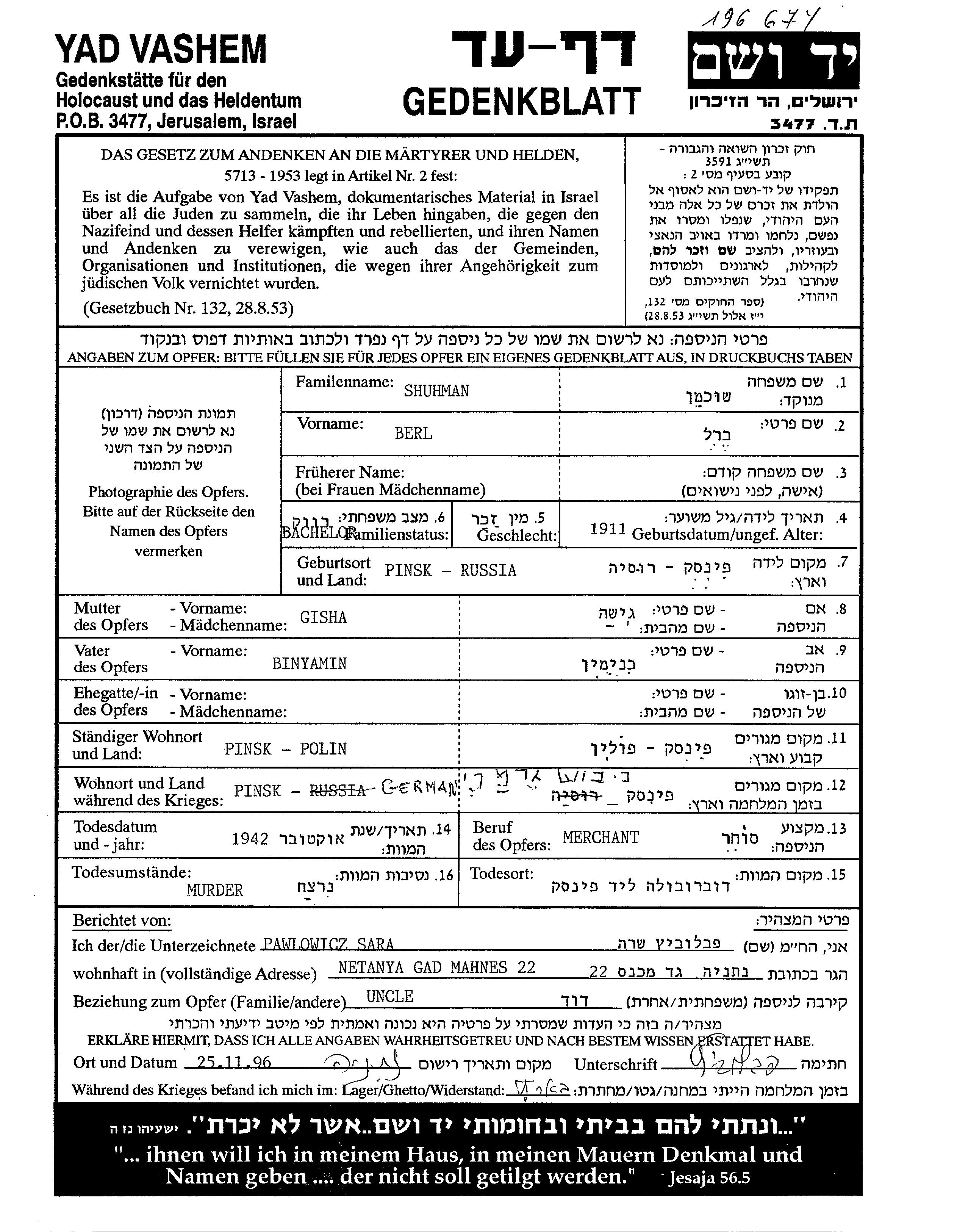 Shukhman Ber 1911 Pinsk, Polen Verfolgtenliste