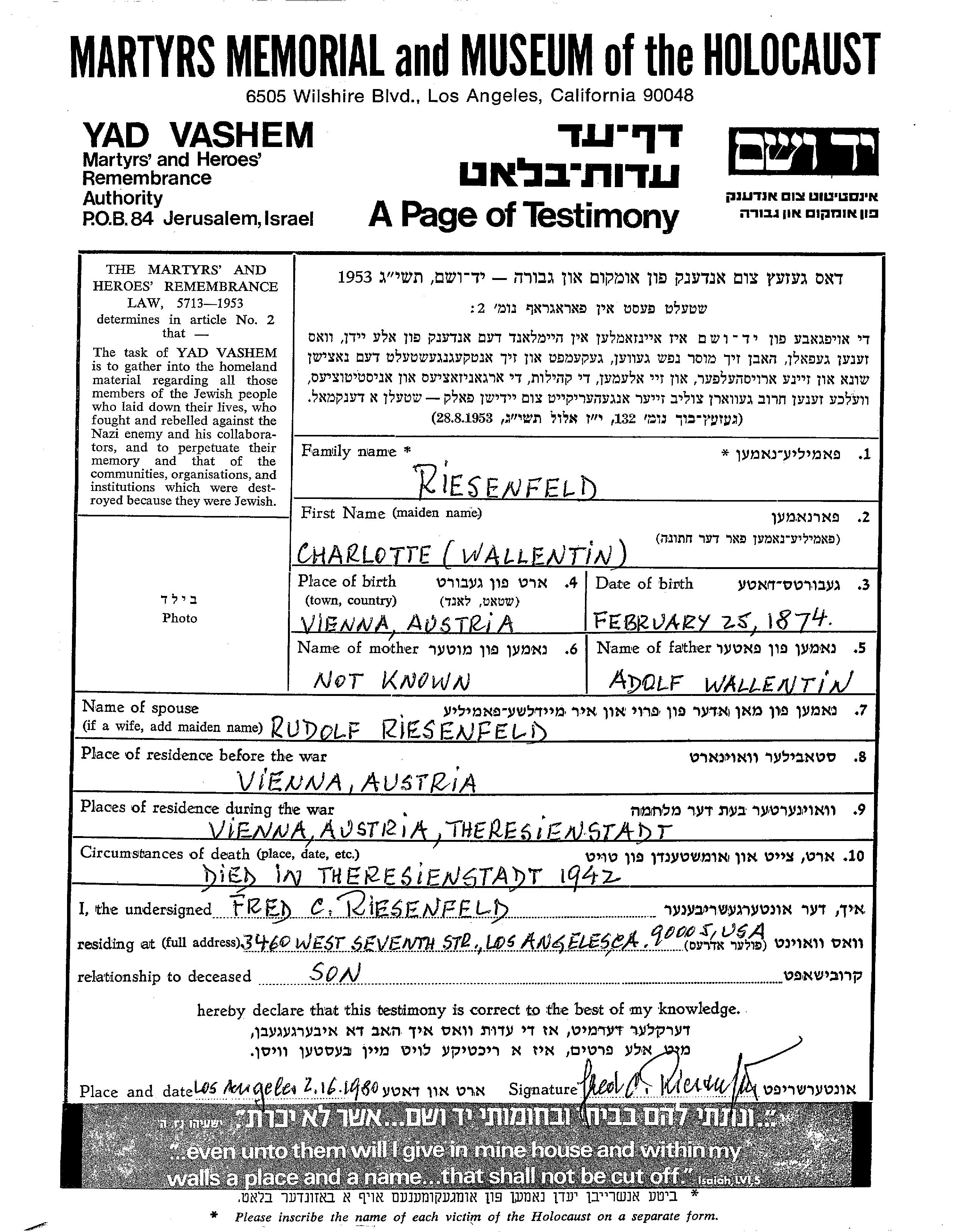 Riesenfeld | Charlotte | 1874 | Wien, Österreich | Liste von ermordeten oesterreichischen Juden |