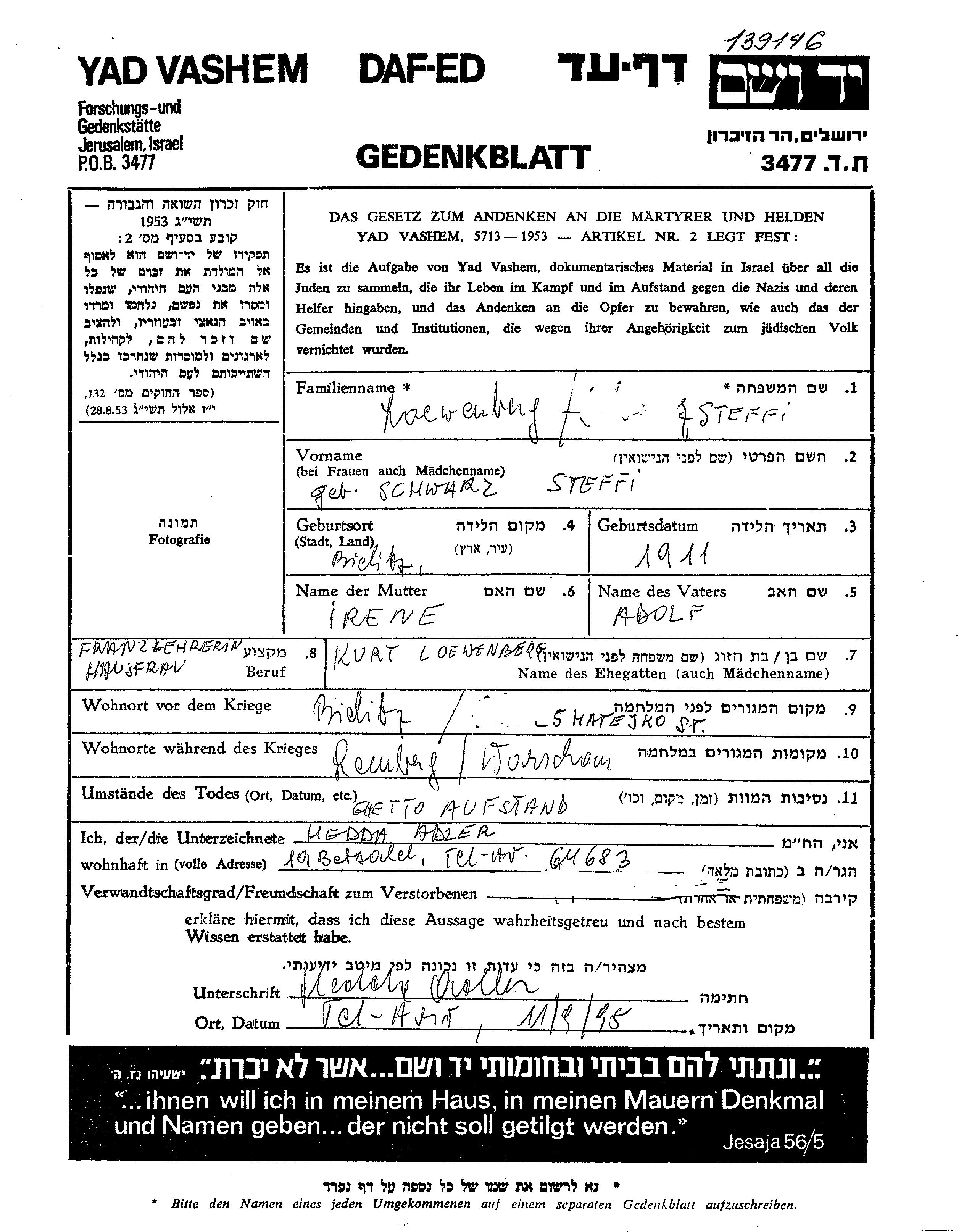 Steffi wurde in der Schoah ermordet. Todesort: Warszawa, Polen im Jahr 1942.
