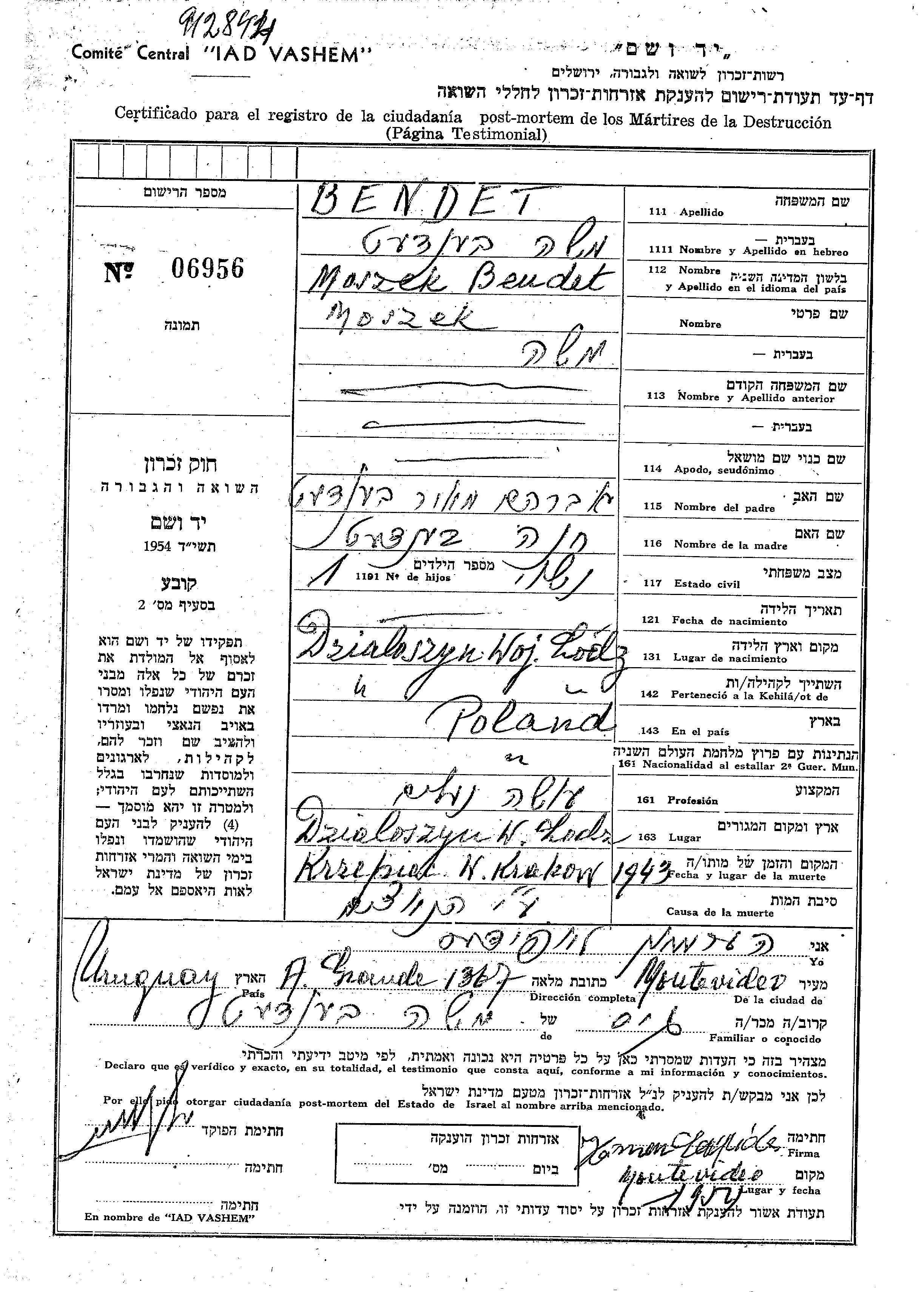 Moisze Bendet wurde im Jahr 1917 in Dzialoszyn, Polen geboren. Vor dem Zweiten Weltkrieg lebte er in Dzialoszyn, Polen.