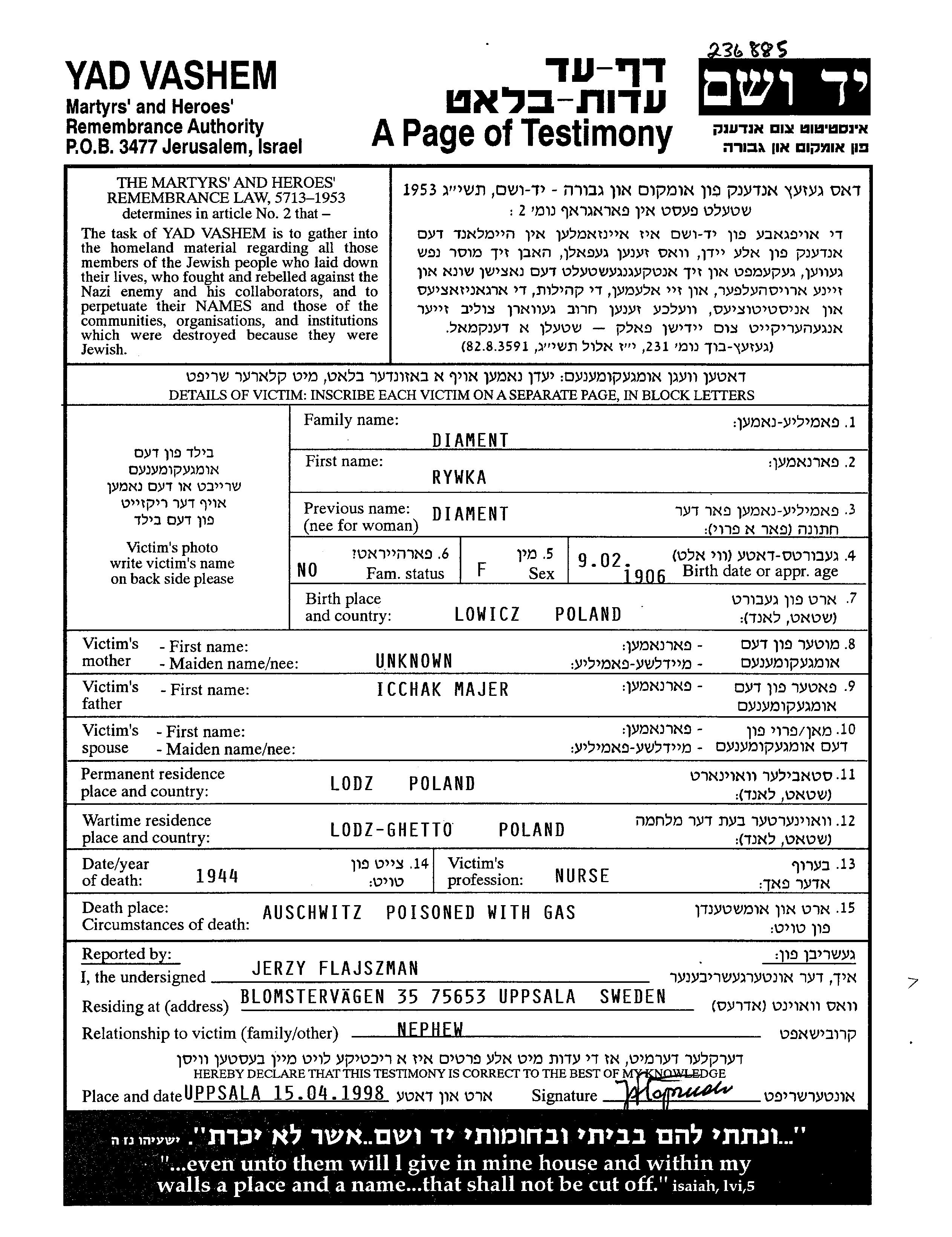 Rywka Diament wurde im Jahr 1906 in Lowicz, Polen geboren. Sie war Krankenpfleger/-in. Vor dem Zweiten Weltkrieg lebte sie in Lodz, Polen.