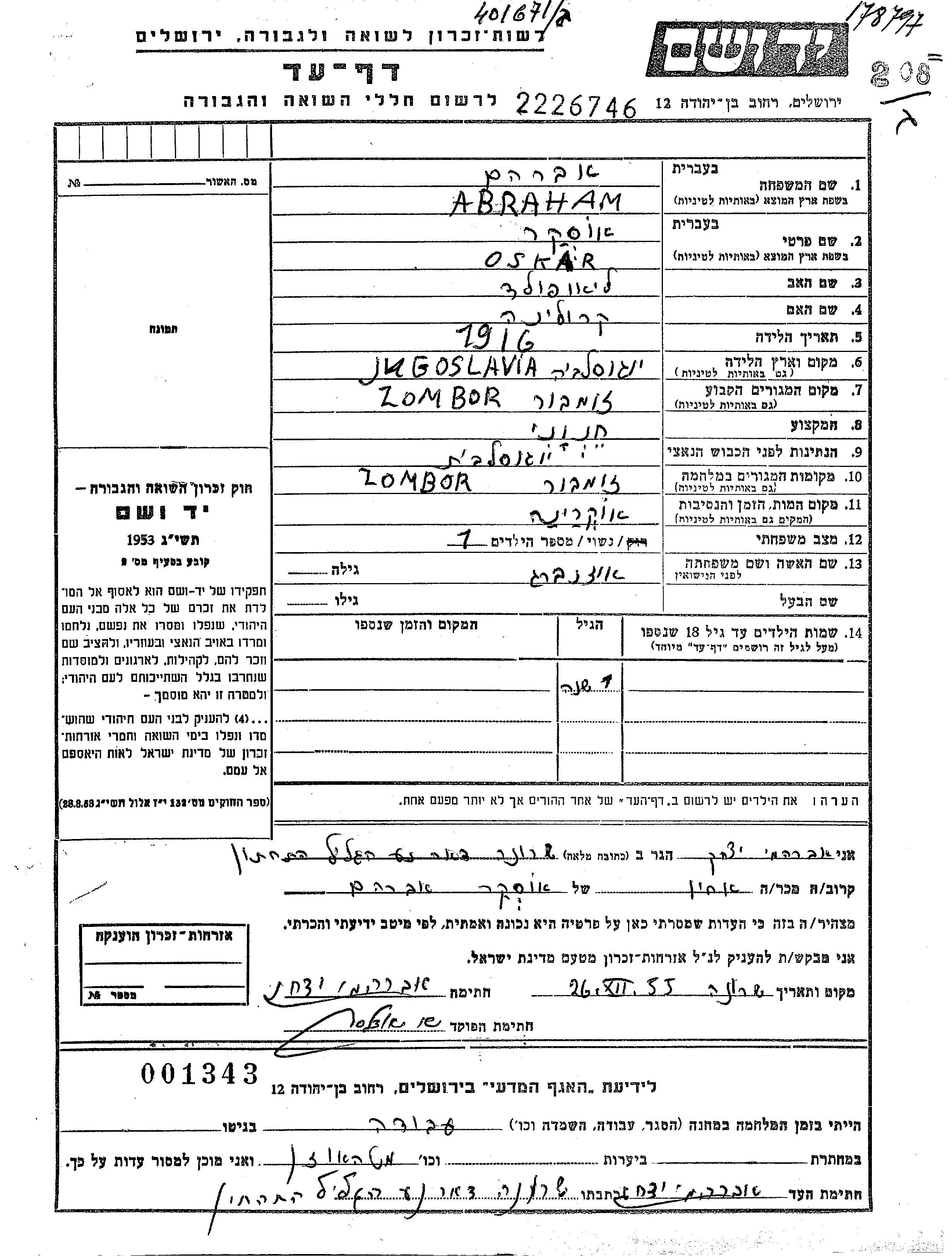 Oszkar Abraham wurde im Jahr 1916 in Stari Sivac, Jugoslawien geboren. Er war Kaufmann/-frau. Vor dem Zweiten Weltkrieg lebte er in Sombor, Jugoslawien.