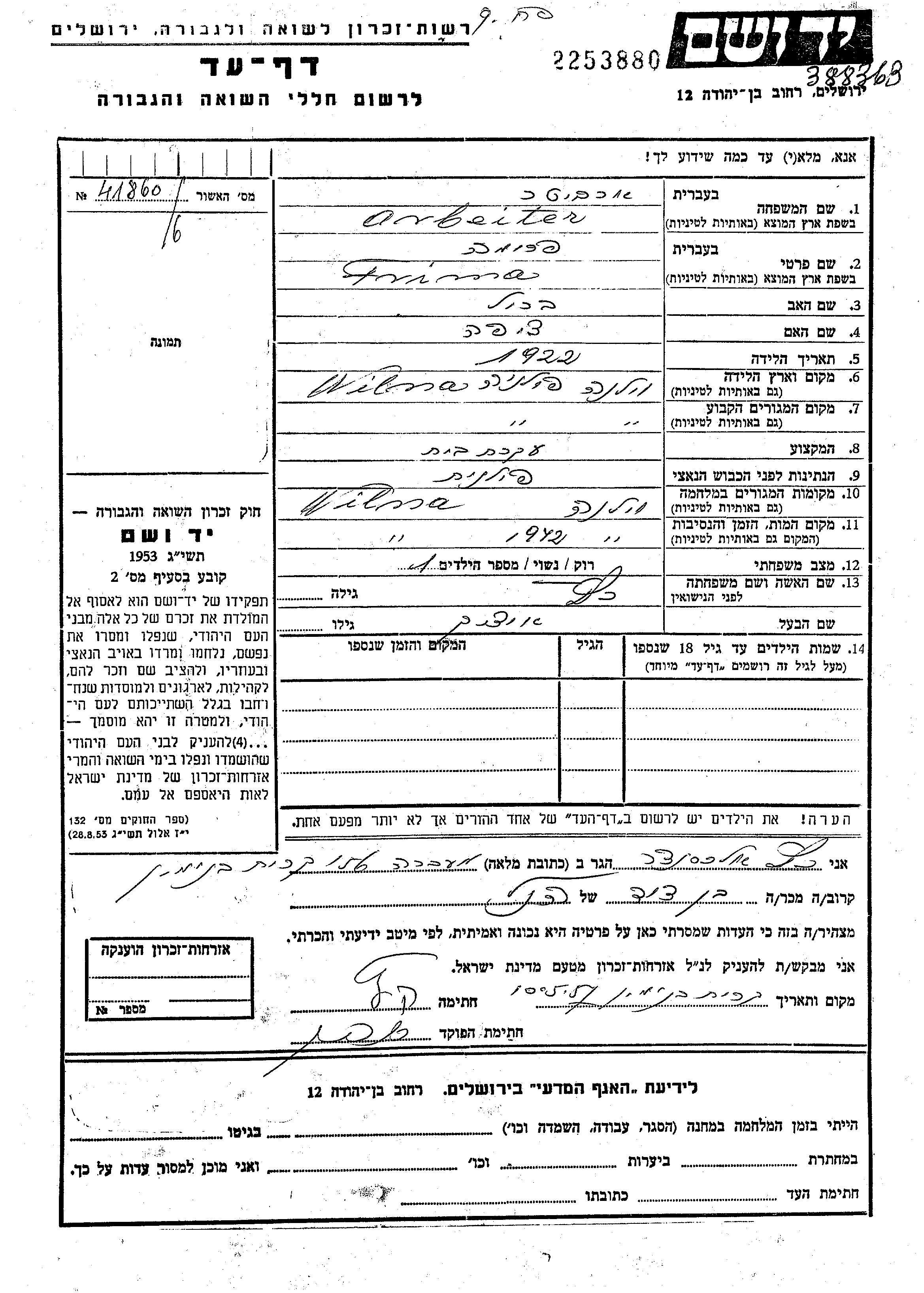 Fruma Arbiter Katz, geb. Katz wurde im Jahr 1922 in Wilno, Polen geboren. Sie war Hausfrau. Vor dem Zweiten Weltkrieg lebte sie in Wilno, Polen.