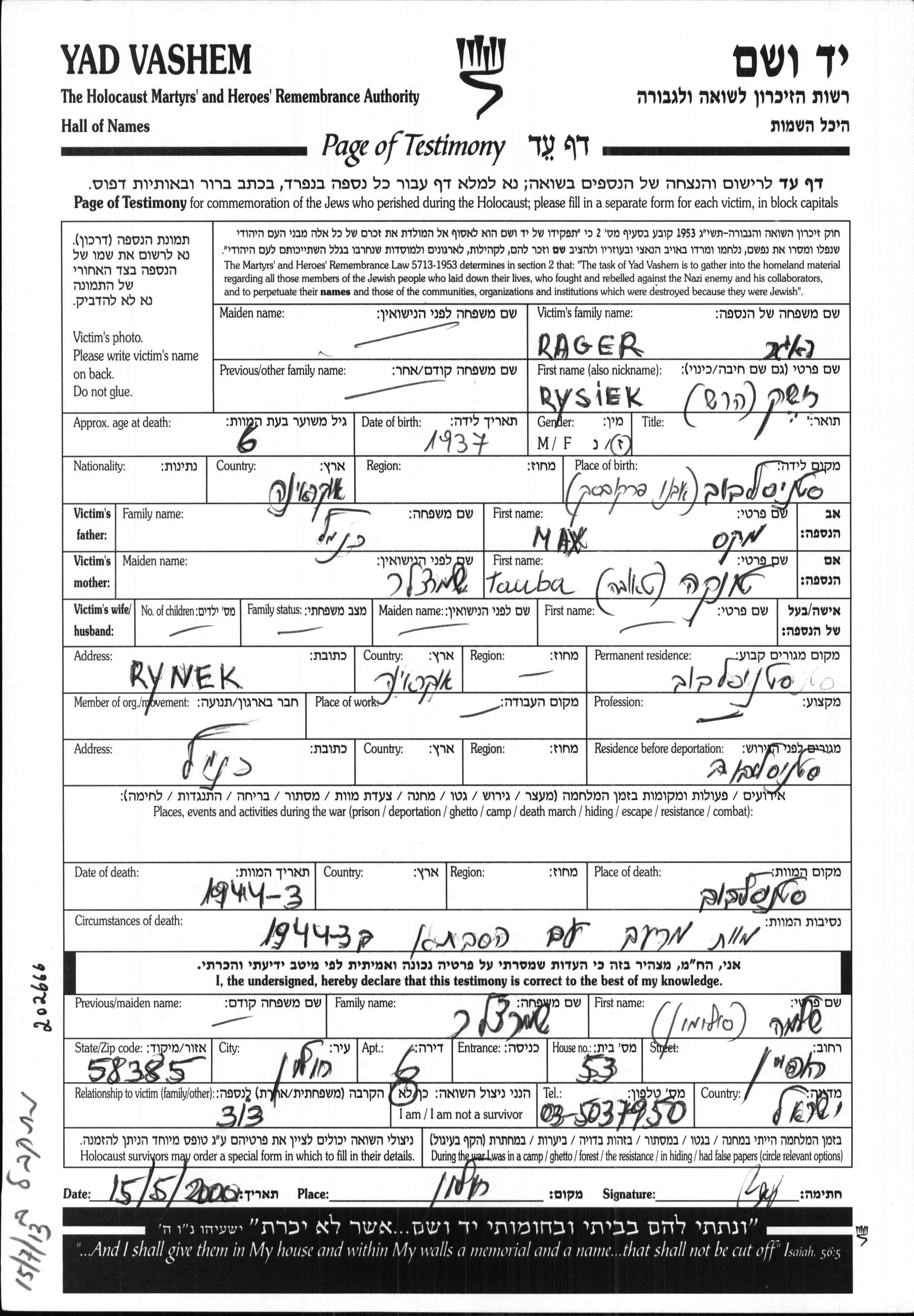 Rysiek Zashek Hersh Rager wurde im Jahr 1937 in Stanislawow, Polen geboren. Vor dem Zweiten Weltkrieg lebte er in Stanislawow, Polen.