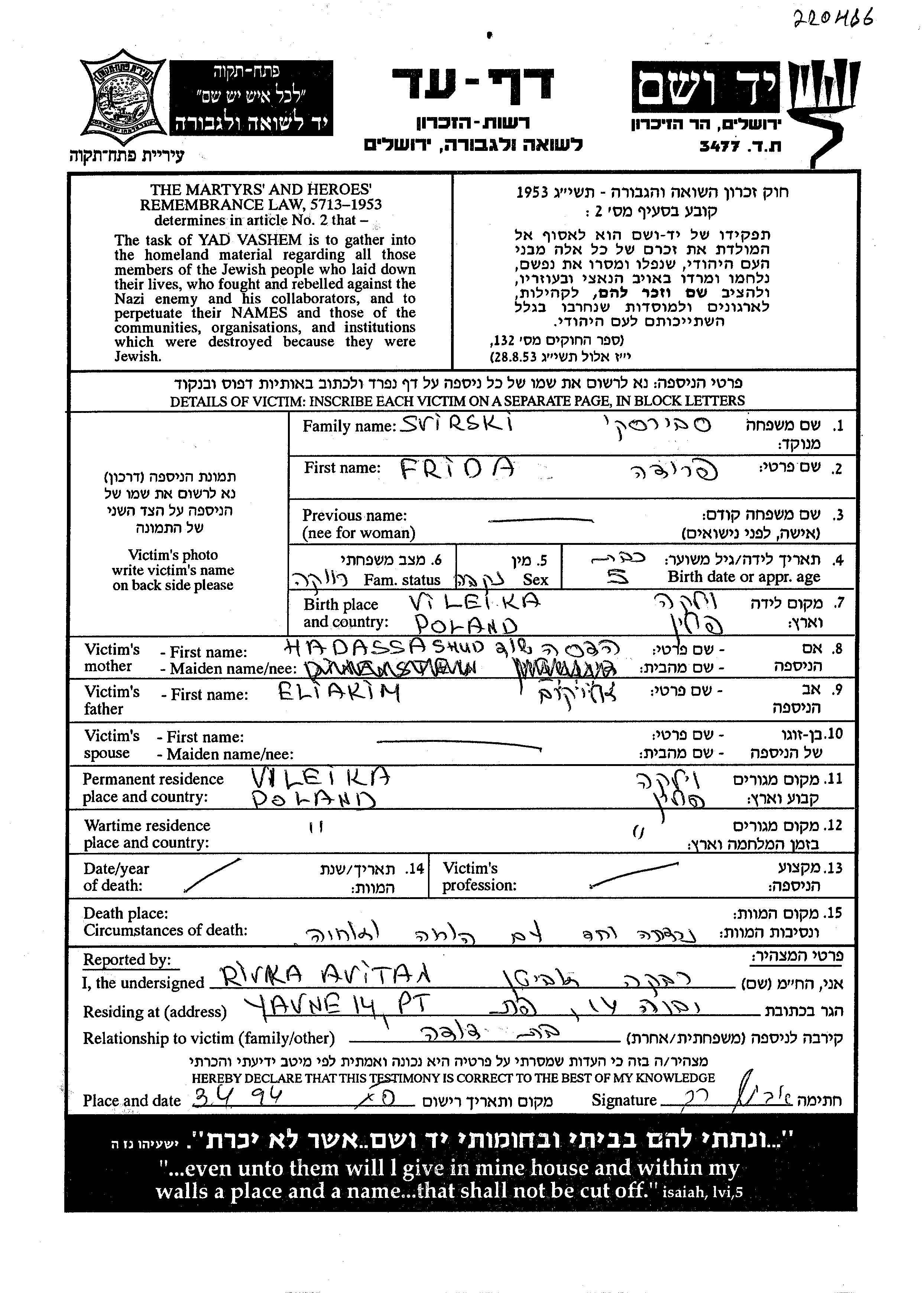 Svirski Friedel Wilejka, Polen Liste ermordeter Juden aus Gedenkbuechern (Yizkor Books)