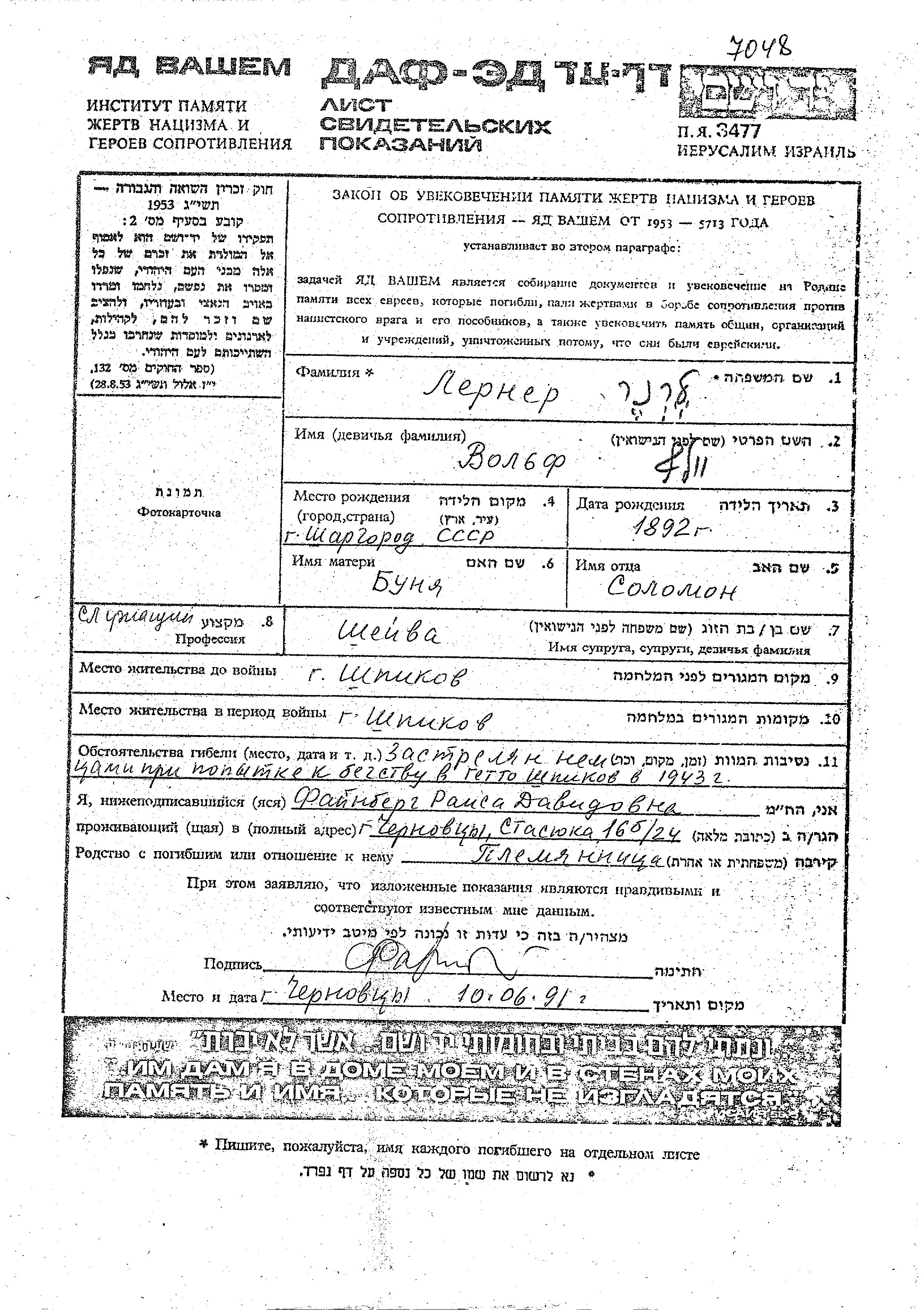 Lerner Volf 1892 Shpikov, Ukraine (UdSSR) Gedenkblatt