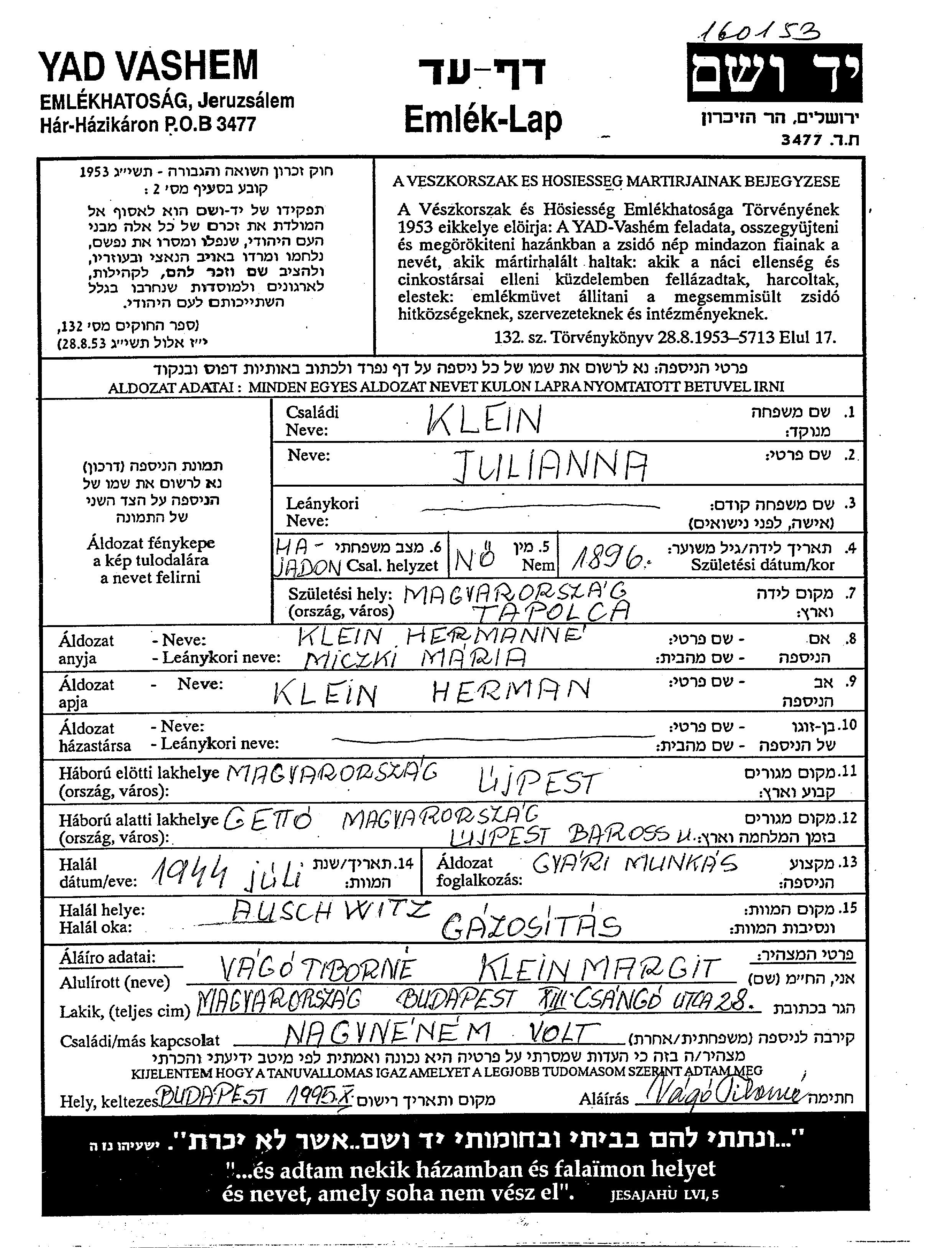 Juliana Klein wurde im Jahr 1896 in Tapolca, Ungarn geboren. Sie war die Tochter von Herman und Maria, geb. Miczki. Sie war Arbeiter/-in und Ledig. Vor dem Zweiten Weltkrieg lebte sie in Ujpest, Ungarn. Während des Krieges war sie in Ujpest, Ungarn.