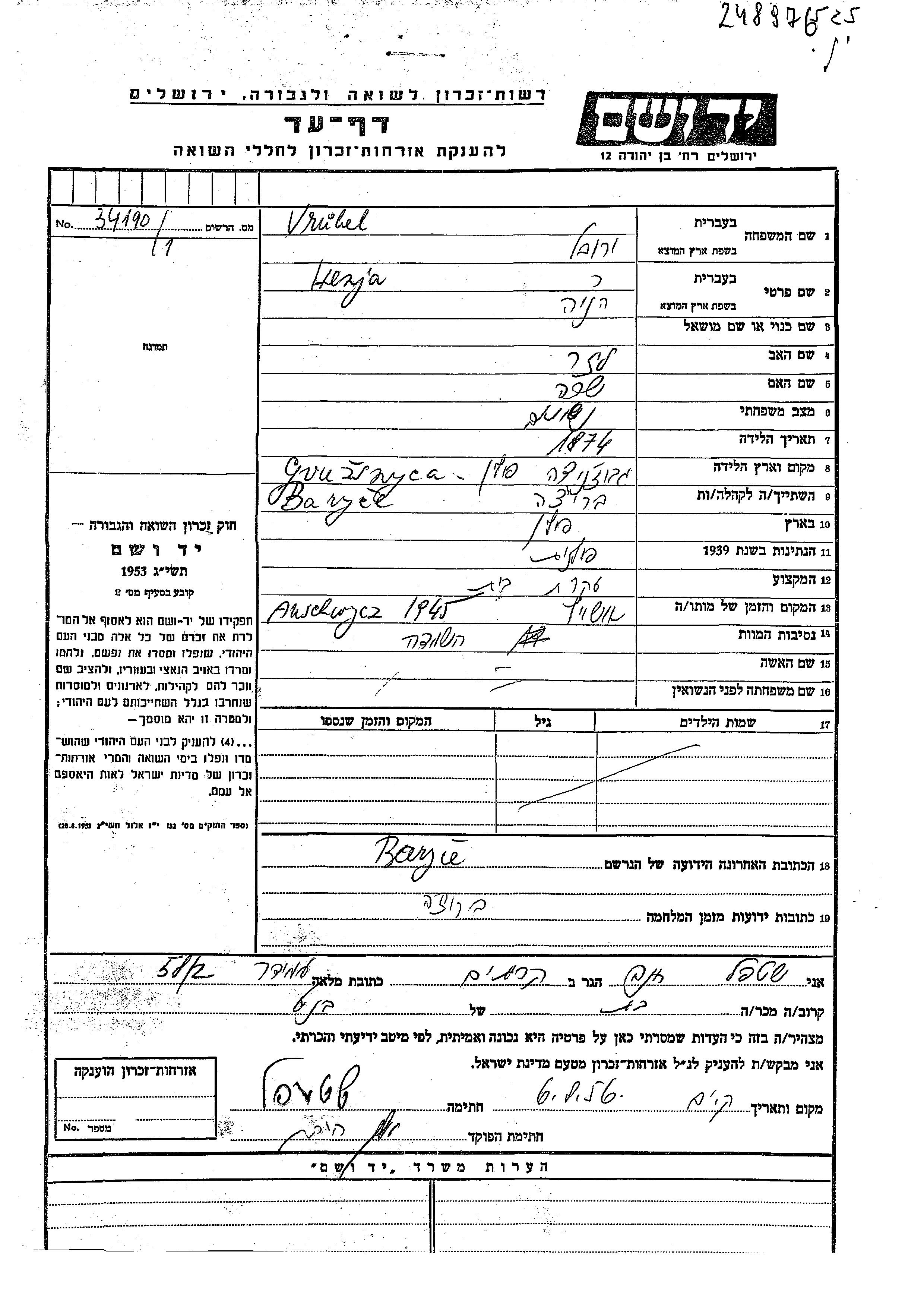 Henja Vrubel wurde im Jahr 1874 in Gwoznica, Polen geboren. Sie war die Tochter von Eliezer und Sara. Sie war Hausfrau und Verheiratet. Vor dem Zweiten Weltkrieg lebte sie in Barycz, Polen. Während des Krieges war sie in Barycz, Polen.