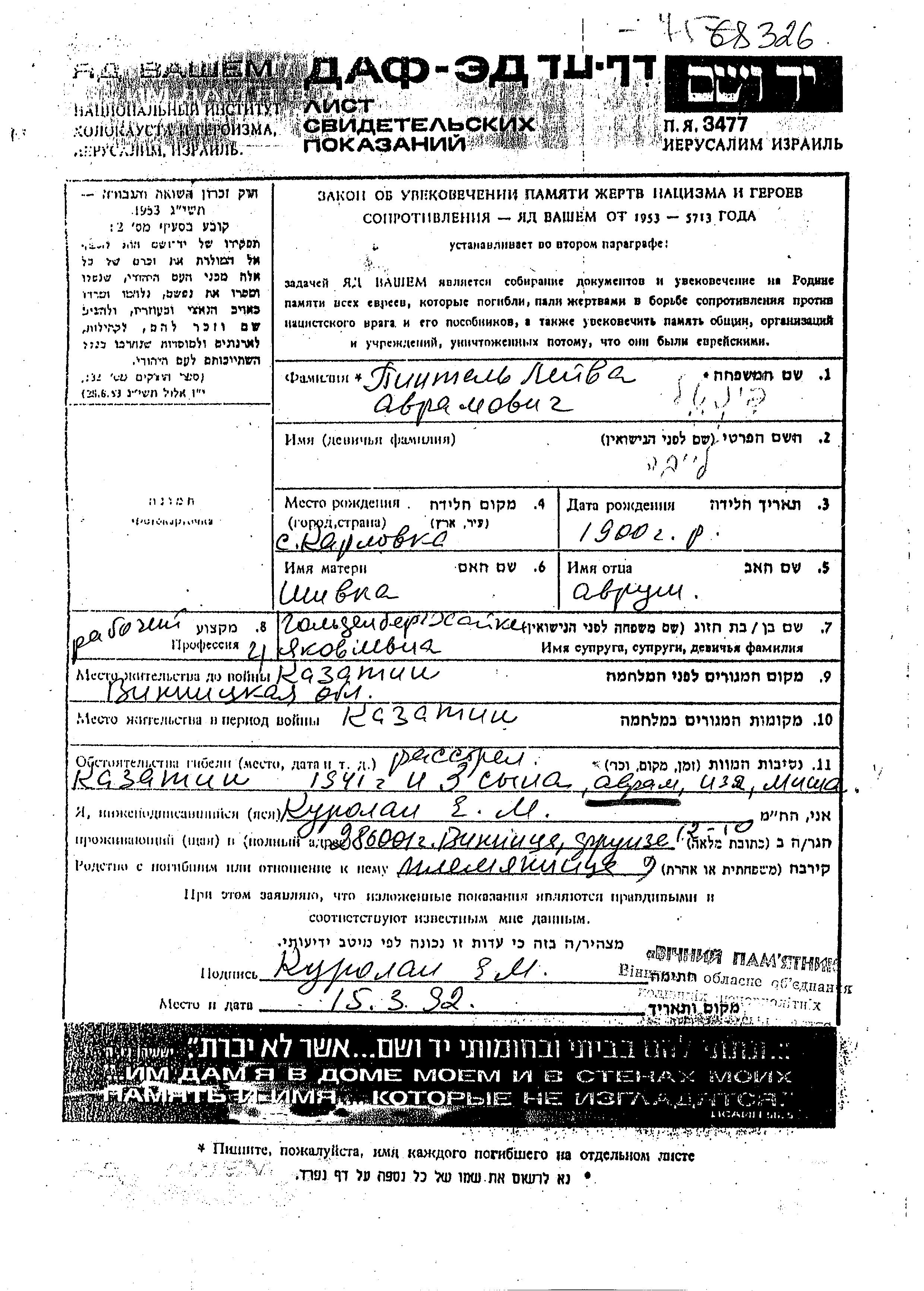 Abram wurde in der Schoah ermordet. Todesort: Kazatin, Ukraine (UdSSR) im Jahr 1941.