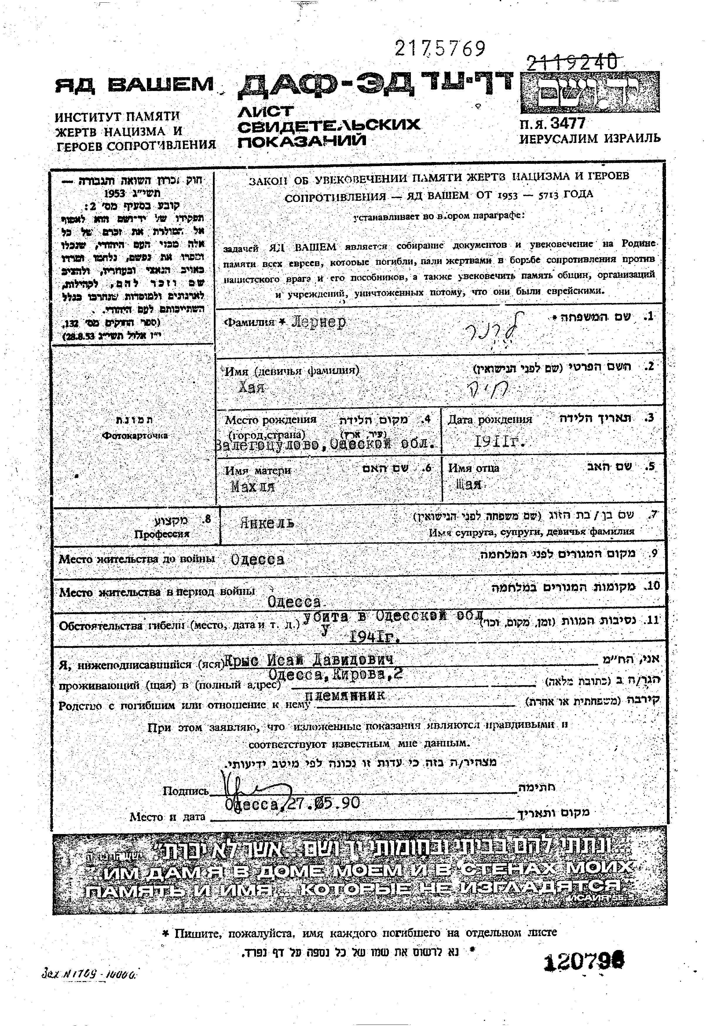 Lerner | Khaia | 1911 | Odessa, Ukraine (UdSSR) | Gedenkblatt |