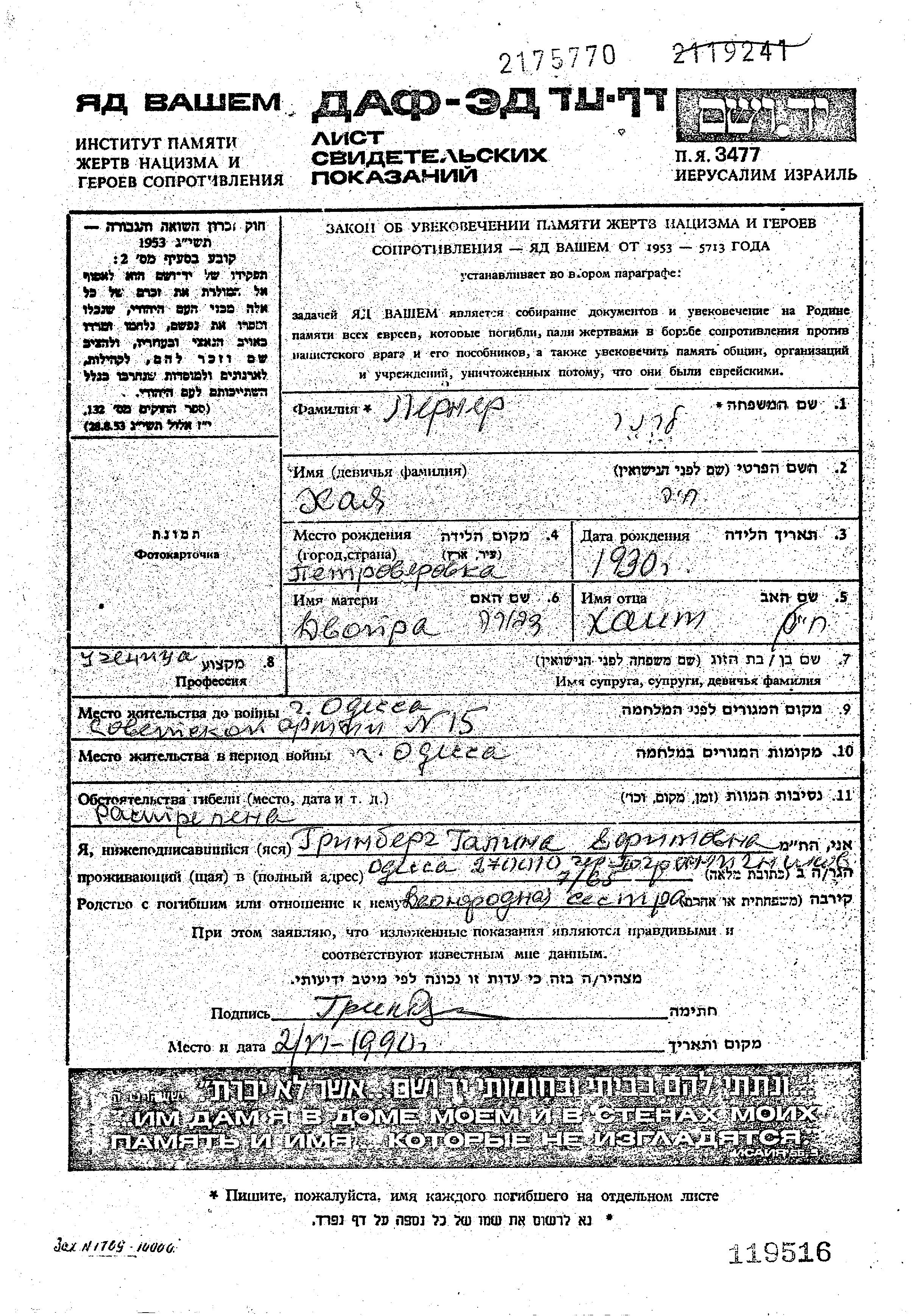 | Lerner | Khaia | 1930 | Odessa, Ukraine (UdSSR) | Gedenkblatt |