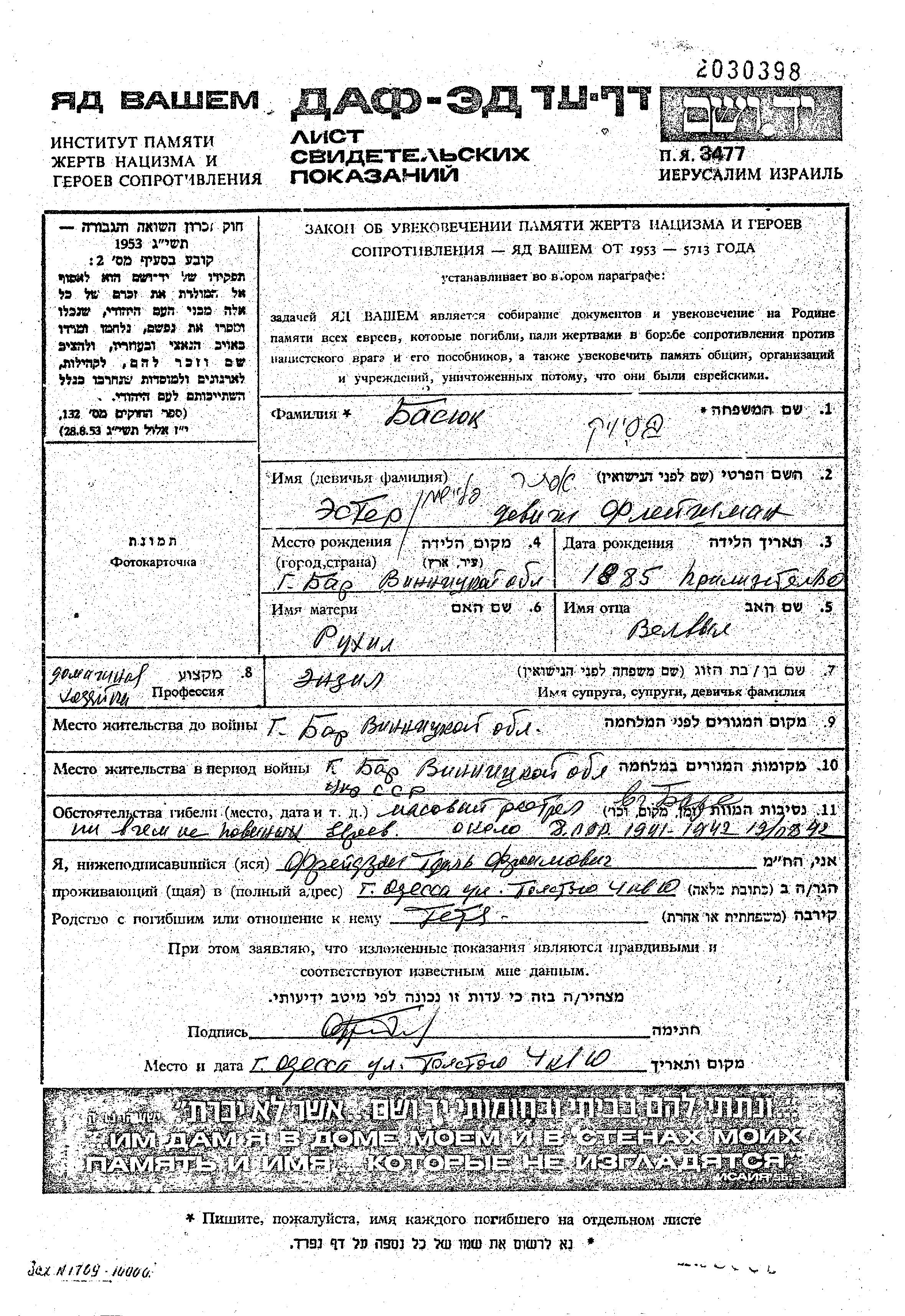 Ester Basyuk, geb. Fleishman wurde im Jahr 1885 in Bar, Ukraine (UdSSR) geboren. Sie war Hausfrau. Vor dem Zweiten Weltkrieg lebte sie in Bar, Ukraine (UdSSR).