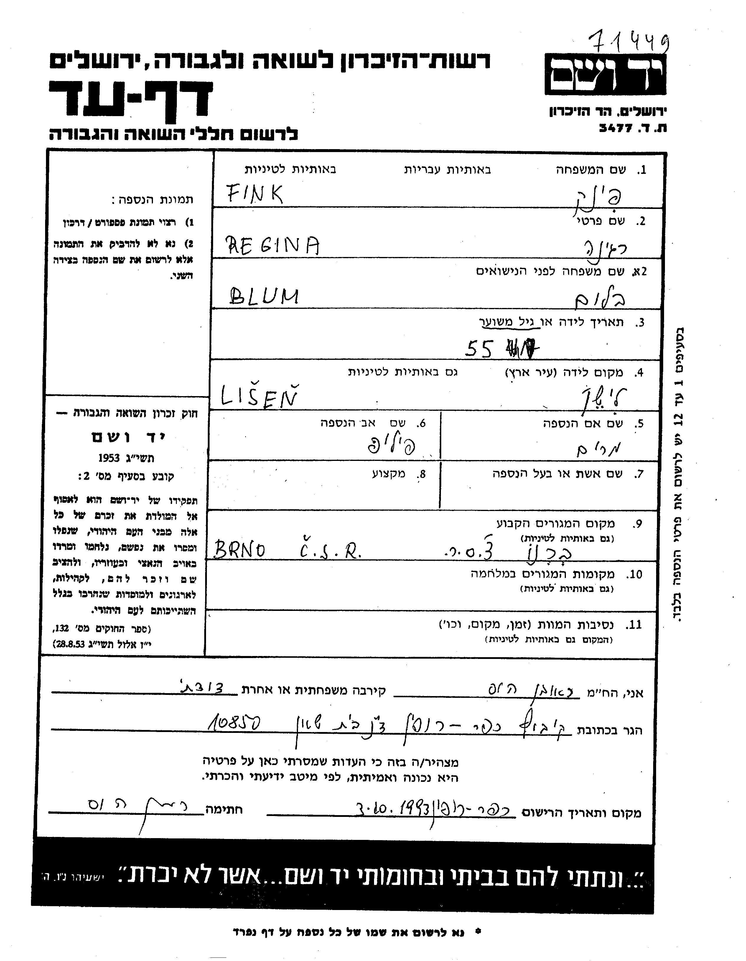 Fink | Regina | Brno, Tschechoslowakei | Gedenkblatt | |