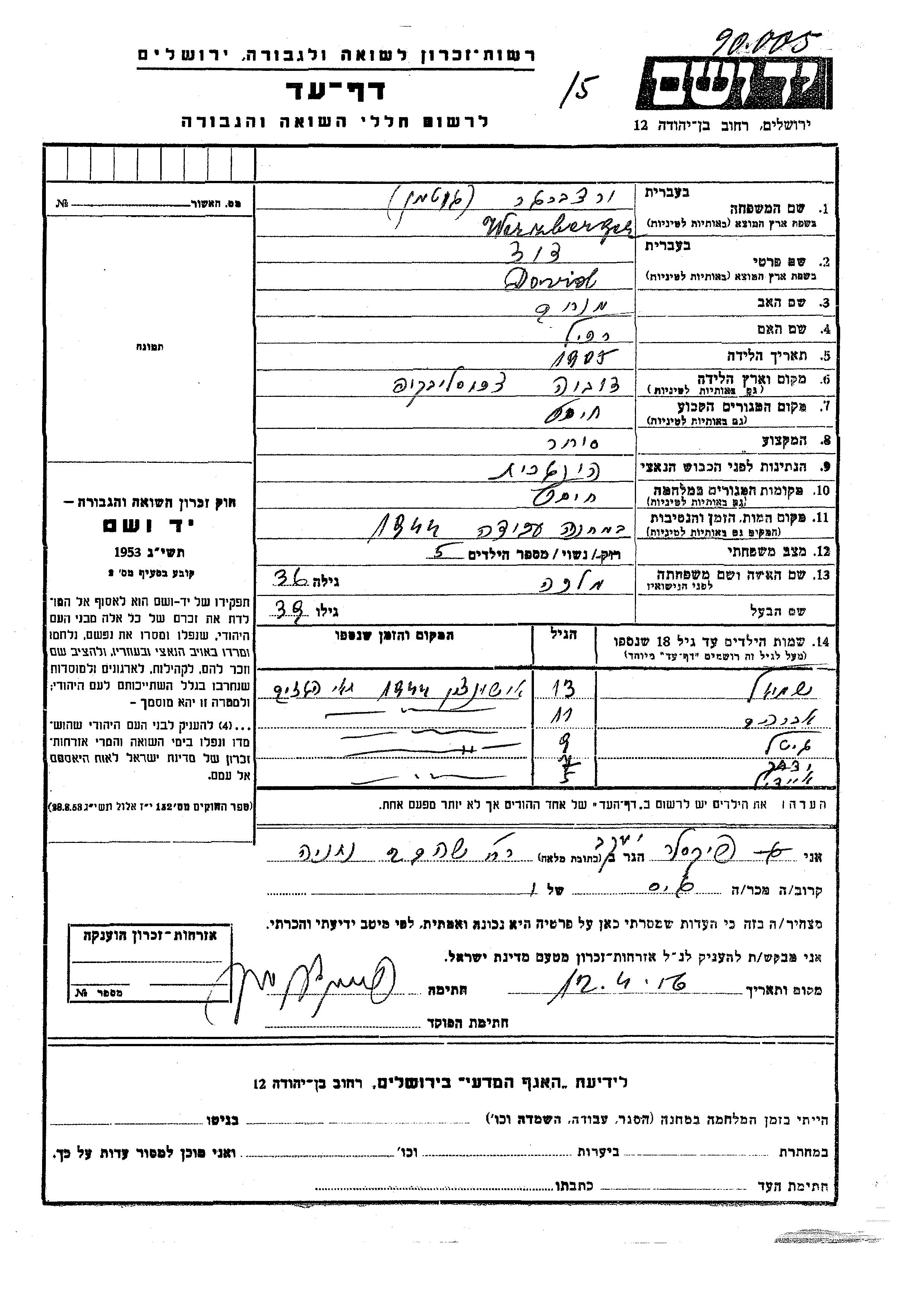 David Werzberger Gutman wurde im Jahr 1905 in Dubi, Tschechoslowakei geboren. Er war der Sohn von Menakhem und Rafil. Er war Kaufmann/-frau und mit Malka Verheiratet. Vor dem Zweiten Weltkrieg lebte er in Hust, Tschechoslowakei. Während des Krieges war er in Hust, Tschechoslowakei.