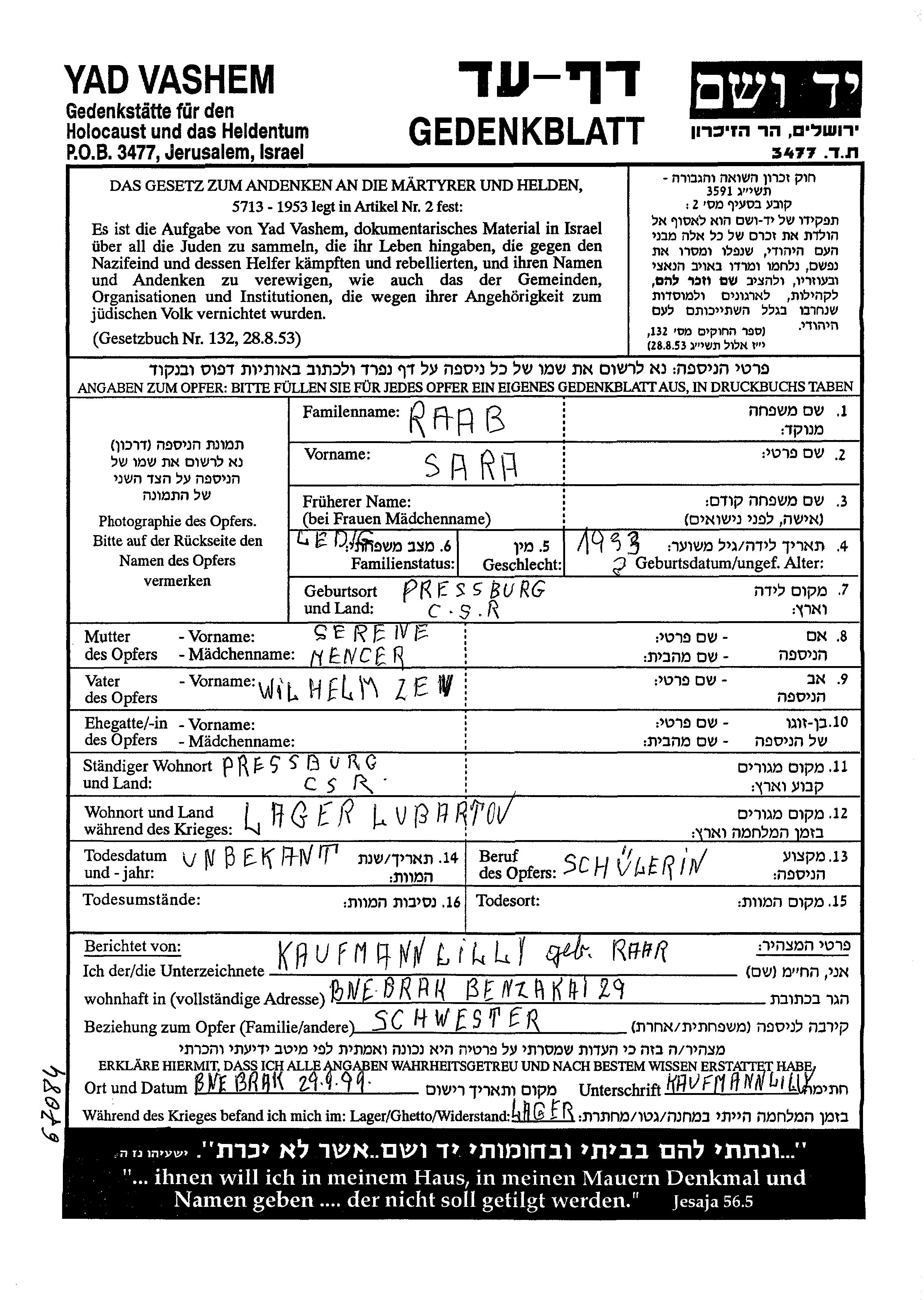 Rab | Sara | 1933 | Pressburg, Tschechoslowakei | Gedenkblatt |