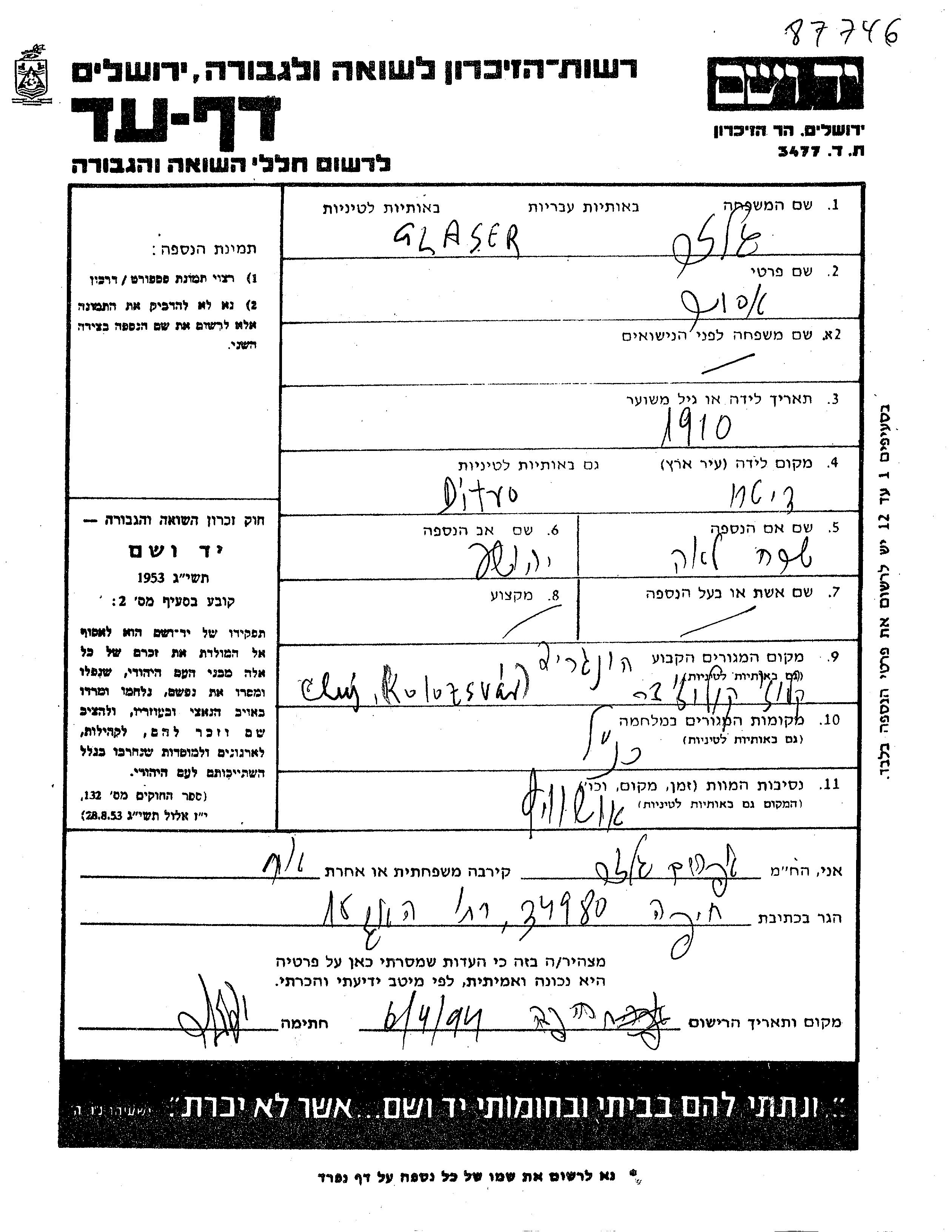 Glazer Ester Cluj, Rumänien Gedenkblatt