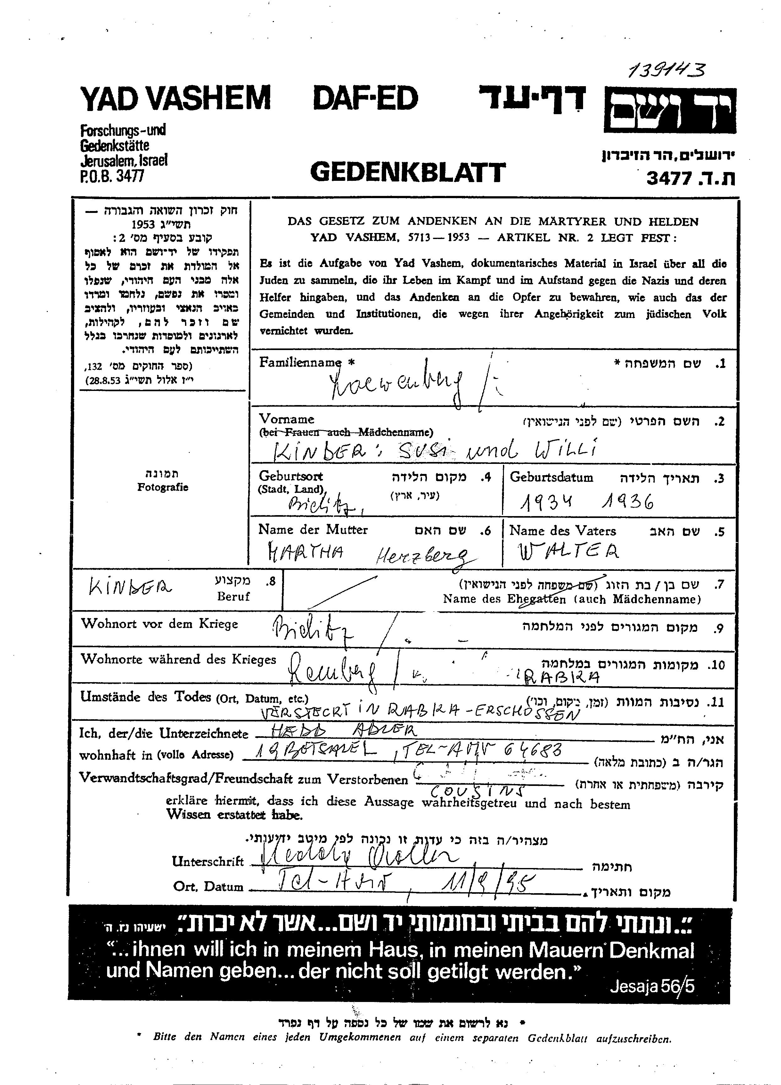 Yad Vashem - Gedenkblätter Sammlung