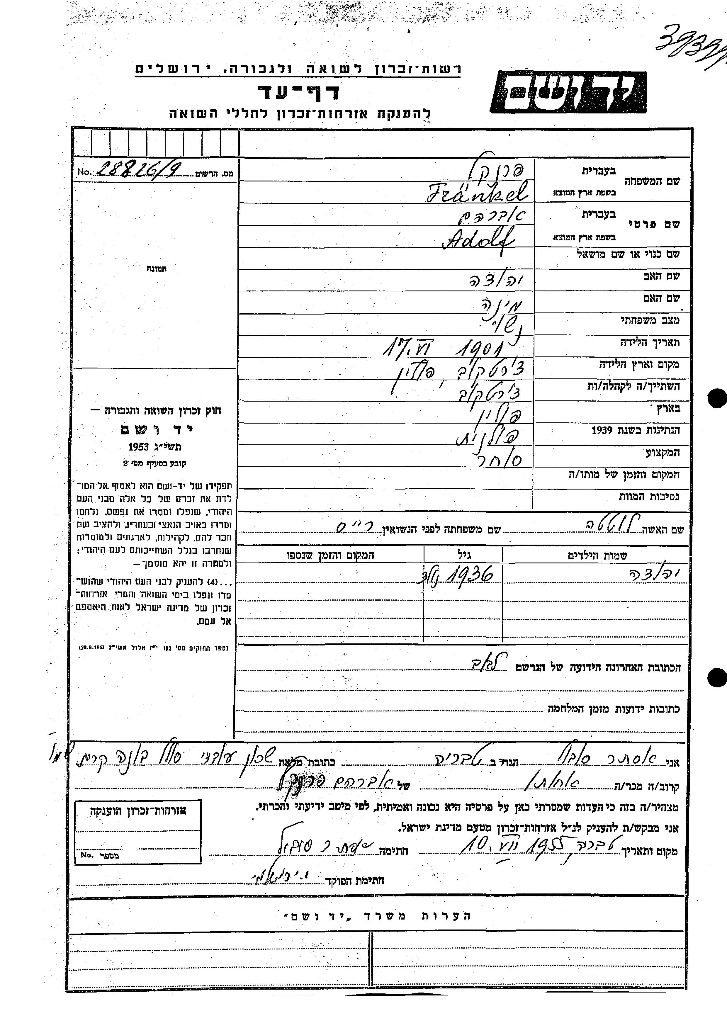 Frenkel Adolf Avraham 1901 Czortkow, Polen Gedenkblatt