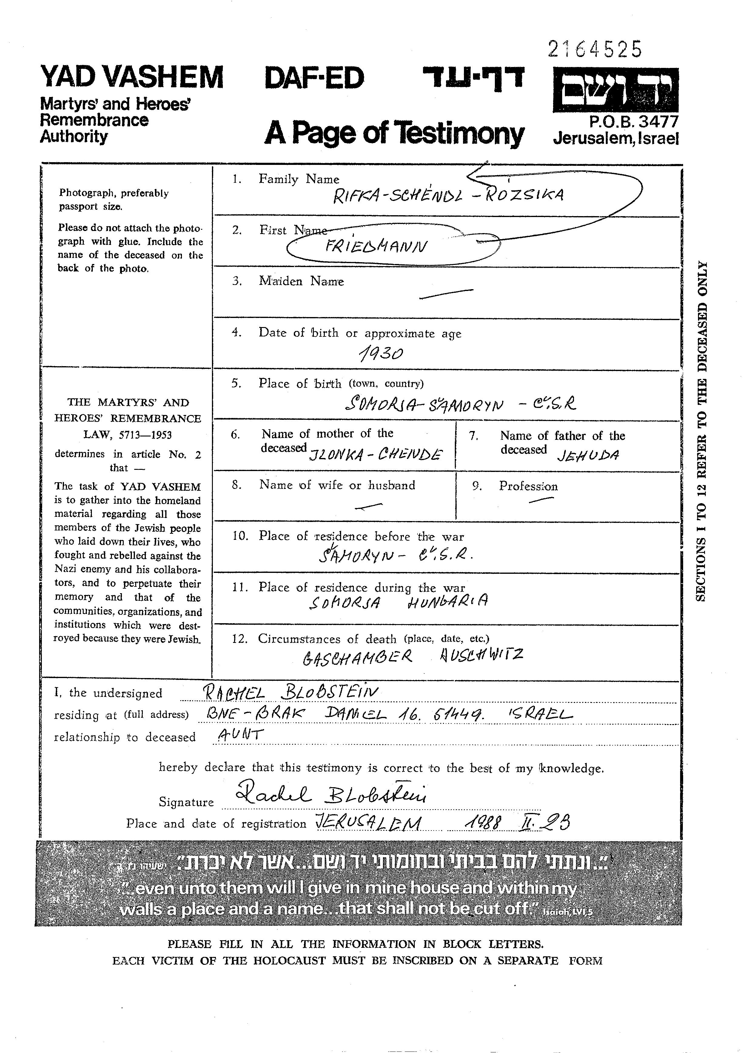 Friedmann Schendl Rivka Roza 1930 Samorin, Tschechoslowakei Gedenkblatt