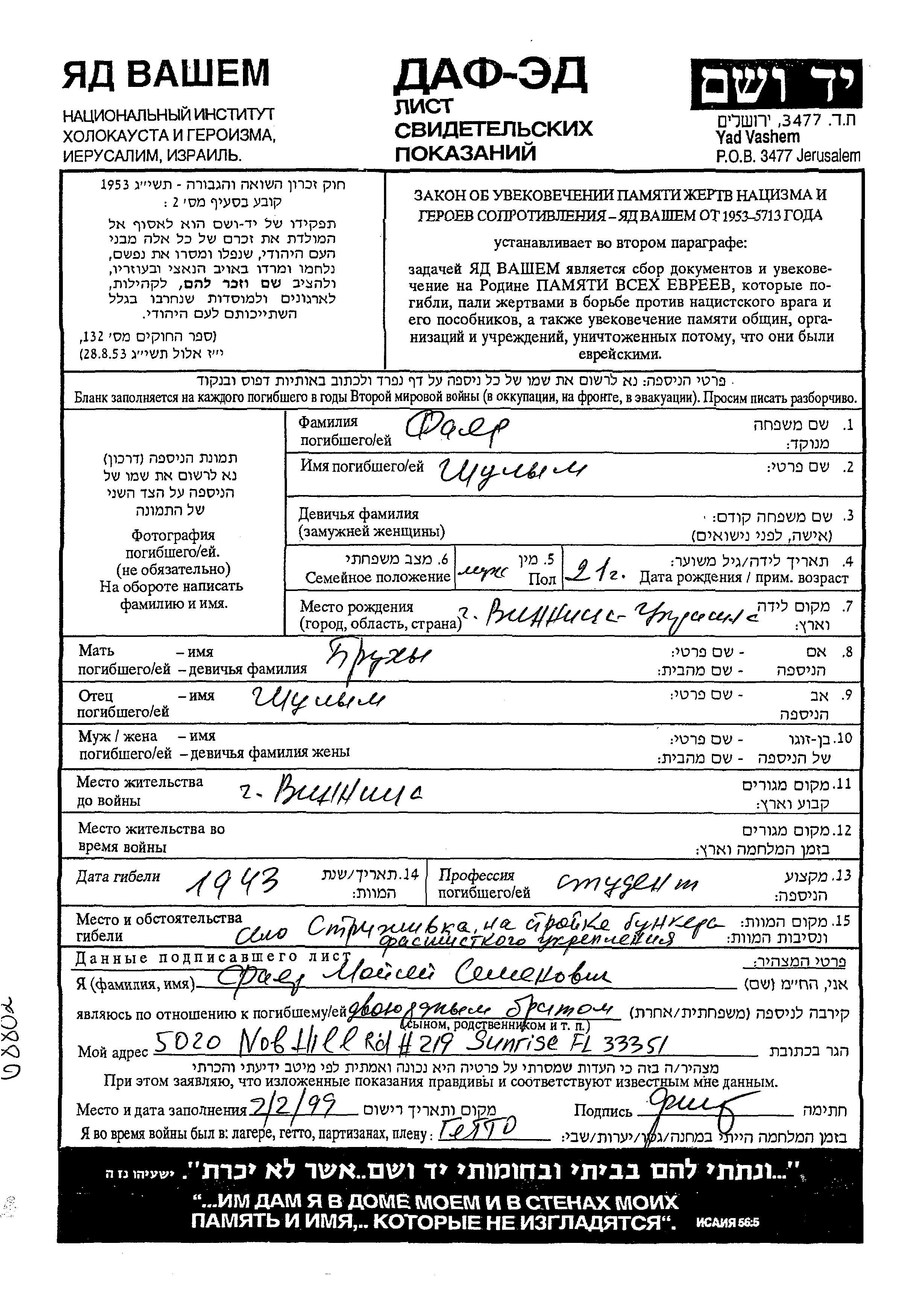 Shulym wurde in der Schoah ermordet. Todesort: Strizhevka, Ukraine (UdSSR) im Jahr 1943.